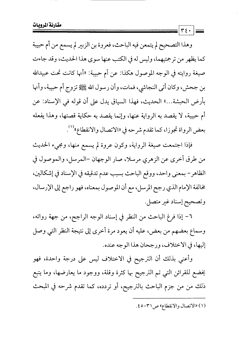 وهذا التصحيح لم يتمعن فيه الباحث، فعروة بن الزبير لم يسمع من أم حبيبة كما يظهر من ترجمتيهما، وليس له في الكتب عنها سوى هذا الحديث، وقد جاءت صيغة روايته في الوجه الموصول هكذا: عن أم حبيبة: «أنها كانت تحت عبيدالله بن جحش، وكان أتى النجاشي، فمات, وأن رسول الله - صلى الله عليه وسلم - تزوج أم حبيبة، وأنها بأرض الحبشة ... » الحديث، فهذا السياق يدل على أن قوله في الإسناد: عن أم حبيبة، لا يقصد به الرواية عنها، وإنما يقصد به حكاية قصتها، وهذا يفعله بعض الرواة تجوزا، كما تقدم شرحه في «الاتصال والانقطاع» (¬١).
