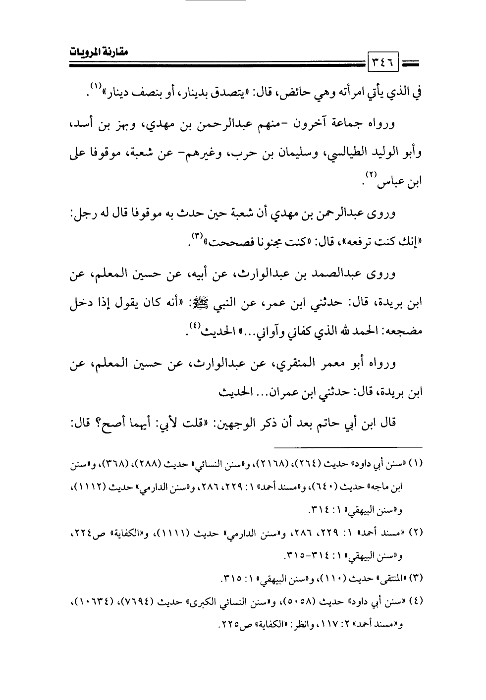 (¬١) «سنن أبي داود» حديث (٢٦٤)، (٢١٦٨)، و «سنن النسائي» حديث (٢٨٨)، (٣٦٨)، و «سنن ابن ماجه» حديث (٦٤٠)، و «مسند أحمد» ١: ٢٢٩، ٢٨٦، و «سنن الدارمي» حديث (١١١٢)، و «سنن البيهقي» ١: ٣١٤.