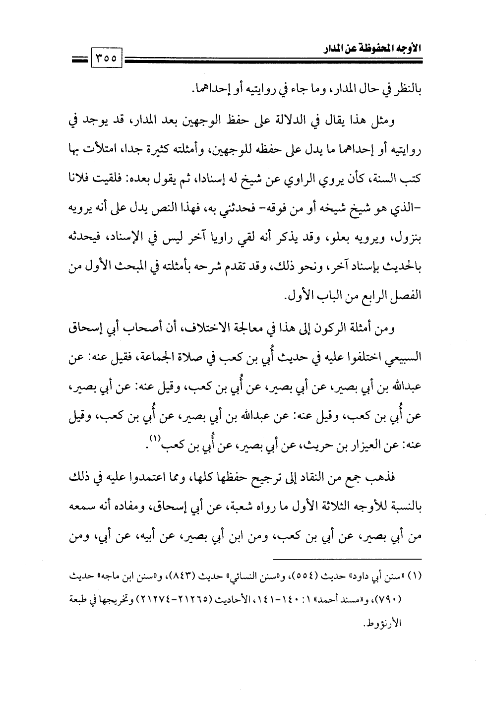 ومثل هذا يقال في الدلالة على حفظ الوجهين بعد المدار، قد يوجد في روايتيه أو إحداهما ما يدل على حفظه للوجهين، وأمثلته كثيرة جدا، امتلأت بها كتب السنة، كأن يروي الراوي عن شيخ له إسنادا، ثم يقول بعده: فلقيت فلانا -الذي هو شيخ شيخه أو من فوقه- فحدثني به, فهذا النص يدل على أنه يرويه بنزول, ويرويه بعلو, وقد يذكر أنه لقي راويا آخر ليس في الإسناد، فيحدثه بالحديث بإسناد آخر، ونحو ذلك، وقد تقدم شرحه بأمثلته في المبحث الأول من الفصل الرابع من الباب الأول.