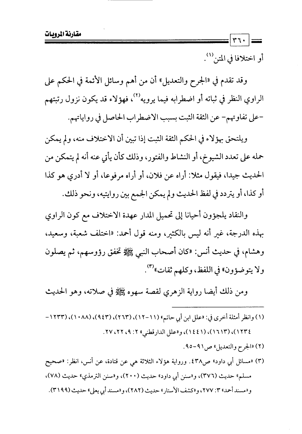 والنقاد يلجؤون أحيانا إلى تحميل المدار عهدة الاختلاف مع كون الراوي بهذه الدرجة، غير أنه ليس بالكثير، ومنه قول أحمد: «اختلف شعبة، وسعيد، وهشام، في حديث أنس: «كان أصحاب النبي - صلى الله عليه وسلم - تخفق رؤوسهم، ثم يصلون ولا يتوضؤون» في اللفظ، وكلهم ثقات» (¬٣).