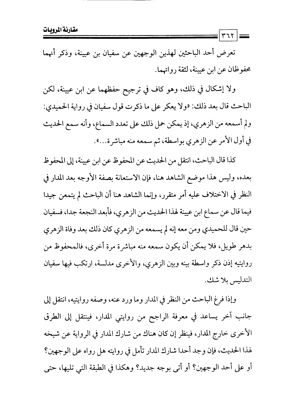 كذا قال الباحث، انتقل من الحديث عن المحفوظ عن ابن عيينة، إلى المحفوظ بعده، وليس هذا موضع الشاهد هنا، فإن الاستعانة بصفة الأوجه بعد المدار في النظر في الاختلاف عليه أمر متقرر، وإنما الشاهد هنا أن الباحث لم يتمعن جيدا فيما قال عن سماع ابن عيينة لهذا الحديث من الزهري، فأبعد النجعة جدا، فسفيان حين قال للحميدي ومن معه إنه لم يسمعه من الزهري كان ذلك بعد وفاة الزهري بدهر طويل، فلا يمكن أن يكون سمعه منه مباشرة مرة أخرى، فالمحفوظ من روايتيه إذن ذكر واسطة بينه وبين الزهري، والأخرى مدلسة، ارتكب فيها سفيان التدليس بلا شك.