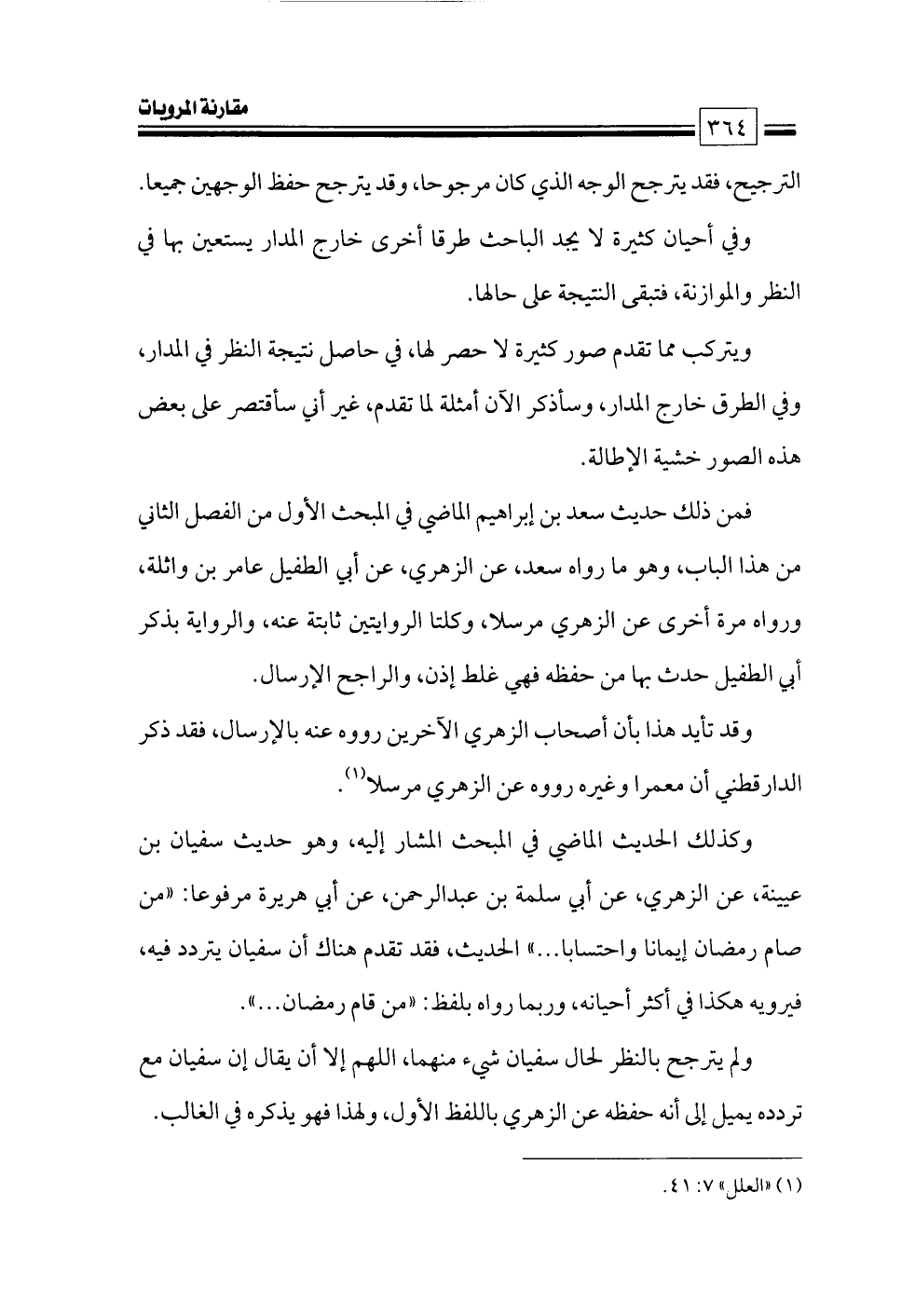 وكذلك الحديث الماضي في المبحث المشار إليه، وهو حديث سفيان بن عيينة، عن الزهري، عن أبي سلمة بن عبدالرحمن، عن أبي هريرة مرفوعا: «من صام رمضان إيمانا واحتسابا ... » الحديث، فقد تقدم هناك أن سفيان يتردد فيه، فيرويه هكذا في أكثر أحيانه، وربما رواه بلفظ: «من قام رمضان ... ».