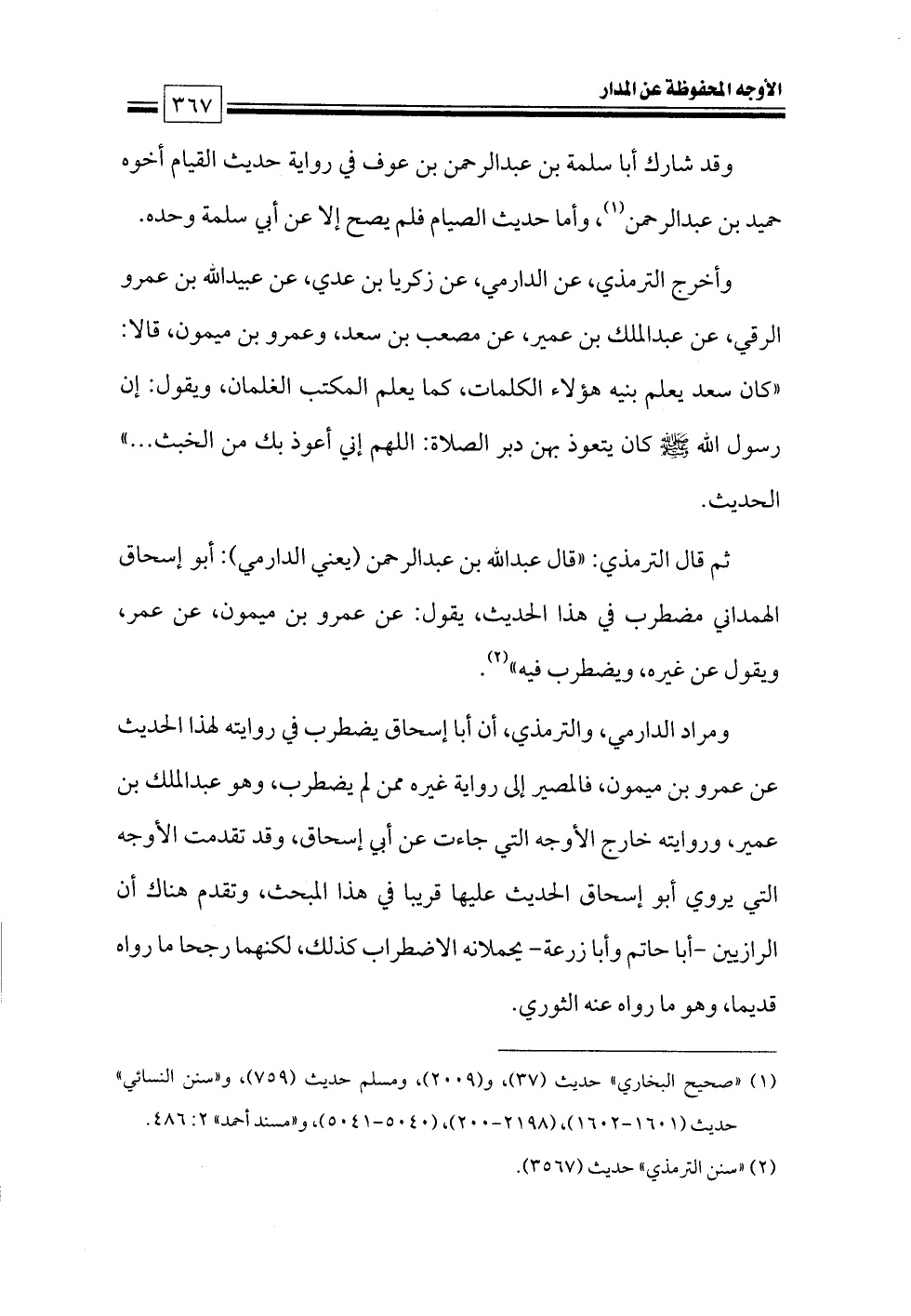 ومراد الدارمي, والترمذي, أن أبا إسحاق يضطرب في روايته لهذا الحديث عن عمرو بن ميمون, فالمصير إلى رواية غيره ممن لم يضطرب, وهو عبدالملك بن عمير, وروايته خارج الأوجه التي جاءت عن أبي إسحاق, وقد تقدمت الأوجه التي يروي أبو إسحاق الحديث عليها قريبا في هذا المبحث, وتقدم هناك أن الرازيين -أبا حاتم وأبا زرعة- يحملانه الاضطراب كذلك, لكنهما رجحا ما رواه قديما, وهو ما رواه عنه الثوري.