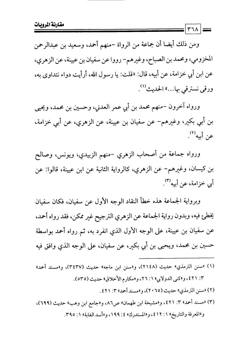 ومن ذلك أيضا أن جماعة من الرواة -منهم أحمد، وسعيد بن عبدالرحمن المخزومي، ومحمد بن الصباح، وغيرهم- رووا عن سفيان بن عيينة، عن الزهري، عن ابن أبي خزامة، عن أبيه، قال: «قلت: يا رسول الله، أرأيت دواء نتداوى به، ورقى نسترقي بها ... » الحديث (¬١).