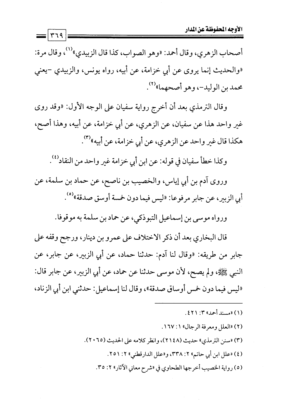 قال البخاري بعد أن ذكر الاختلاف على عمرو بن دينار، ورجح وقفه على جابر من طريقه: «وقال لنا آدم: حدثنا حماد، عن أبي الزبير، عن جابر، عن النبي - صلى الله عليه وسلم -، ولم يصح، لأن موسى حدثنا عن حماد، عن أبي الزبير، عن جابر قال: «ليس فيما دون خمس أوساق صدقة»، وقال لنا إسماعيل: حدثني ابن أبي الزناد،