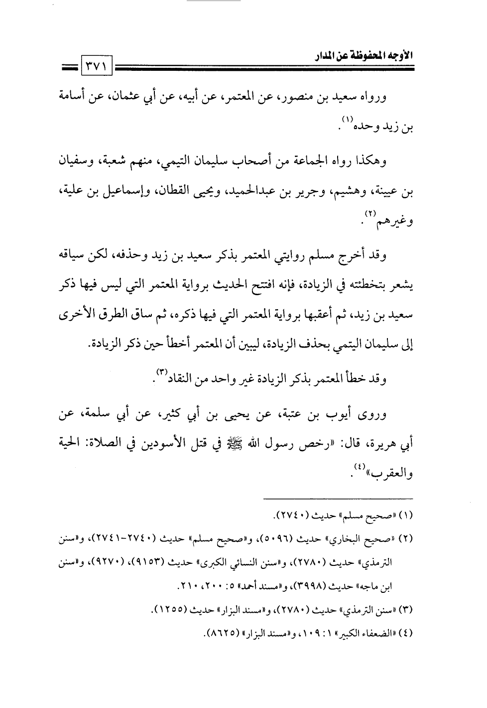 ورواه سعيد بن منصور، عن المعتمر، عن أبيه، عن أبي عثمان، عن أسامة بن زيد وحده (¬١).
