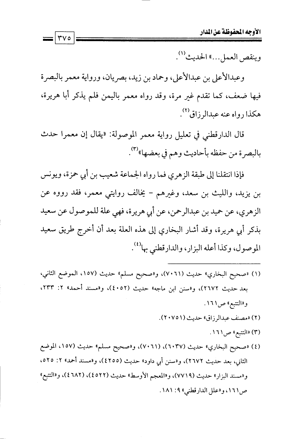 فإذا انتقلنا إلى طبقة الزهري فما رواه الجماعة شعيب بن أبي حمزة، ويونس بن يزيد، والليث بن سعد، وغيرهم - يخالف روايتي معمر، فقد رووه عن الزهري، عن حميد بن عبدالرحمن، عن أبي هريرة، فهي علة للموصول عن سعيد بذكر أبي هريرة، وقد أشار البخاري إلى هذه العلة بعد أن أخرج طريق سعيد الموصول، وكذا أعله البزار, والدارقطني بها (¬٤).
