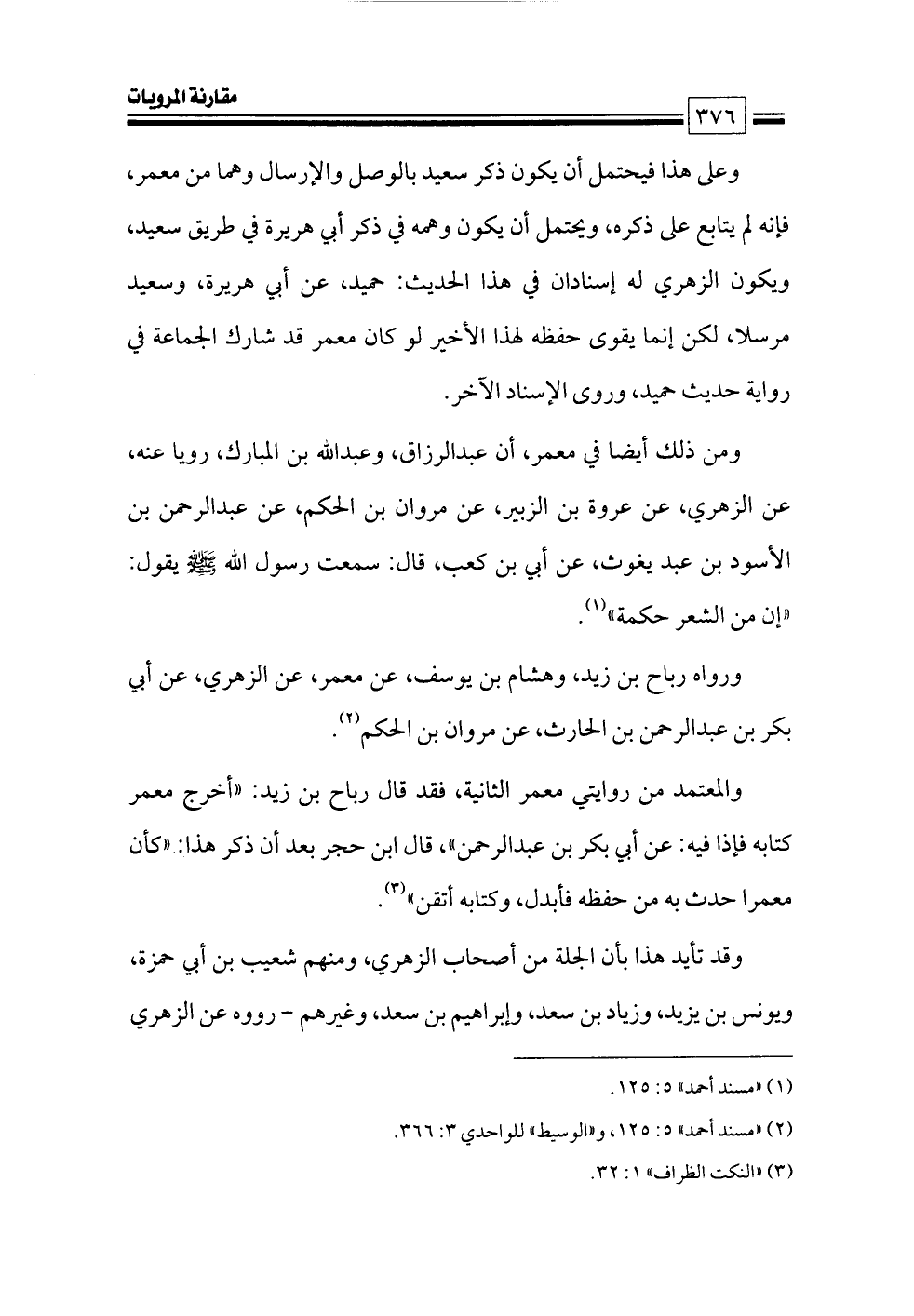 ومن ذلك أيضا في معمر، أن عبدالرزاق، وعبدالله بن المبارك، رويا عنه، عن الزهري، عن عروة بن الزبير، عن مروان بن الحكم، عن عبدالرحمن بن الأسود بن عبد يغوث، عن أبي بن كعب، قال: سمعت رسول الله - صلى الله عليه وسلم - يقول: «إن من الشعر حكمة» (¬١).