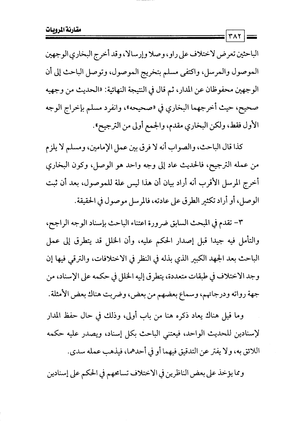 الباحثين تعرض لاختلاف على راو، وصلا وإرسالا، وقد أخرج البخاري الوجهين الموصول والمرسل، واكتفى مسلم بتخريج الموصول، وتوصل الباحث إلى أن الوجهين محفوظان عن المدار، ثم قال في النتيجة النهائية: «الحديث من وجهيه صحيح، حيث أخرجهما البخاري في «صحيحه»، وانفرد مسلم بإخراج الوجه الأول فقط، ولكن البخاري مقدم، والجمع أولى من الترجيح».