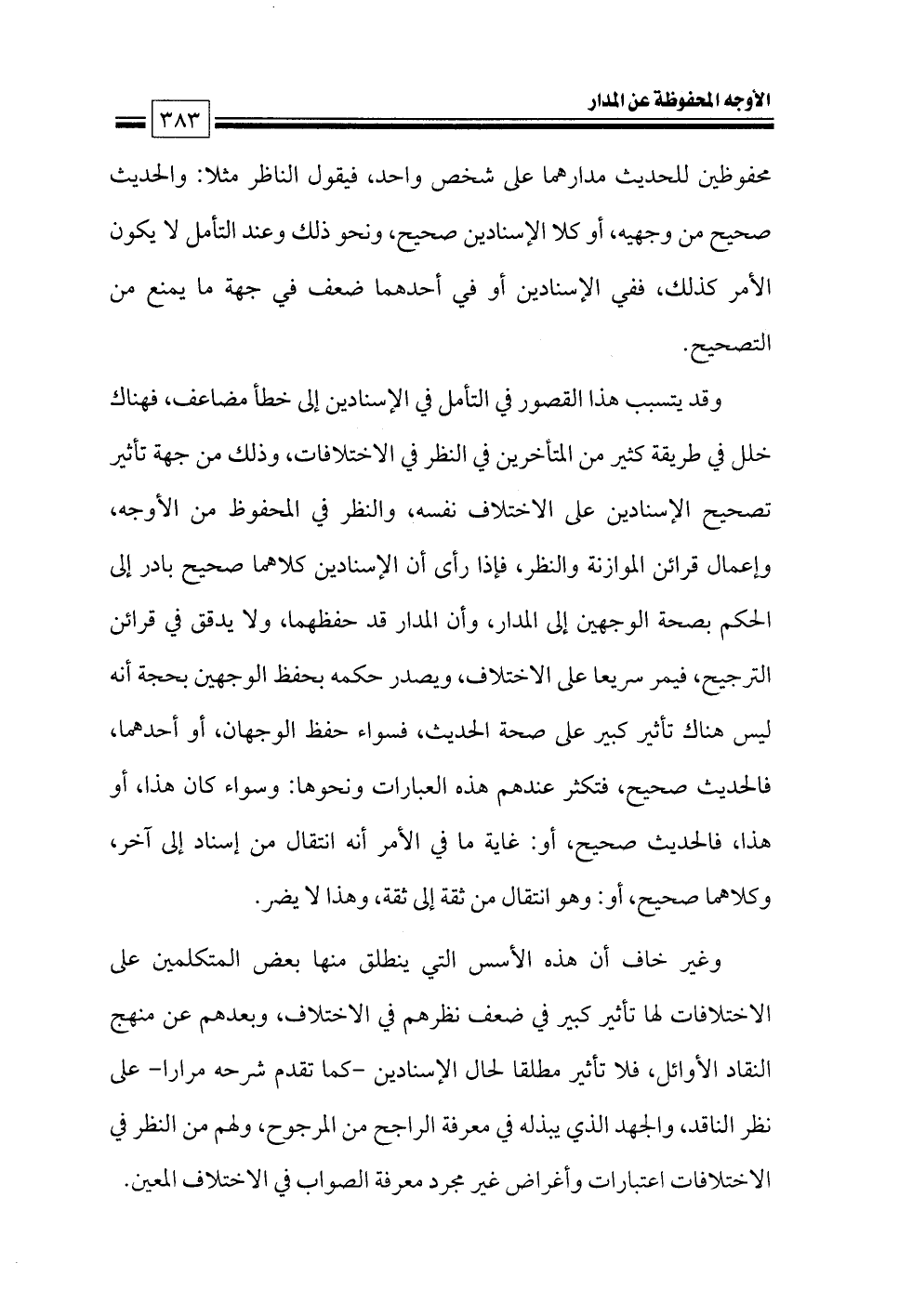 محفوظين للحديث مدارهما على شخص واحد، فيقول الناظر مثلا: والحديث صحيح من وجهيه، أو كلا الإسنادين صحيح، ونحو ذلك وعند التأمل لا يكون الأمر كذلك، ففي الإسنادين أو في أحدهما ضعف في جهة ما يمنع من التصحيح.