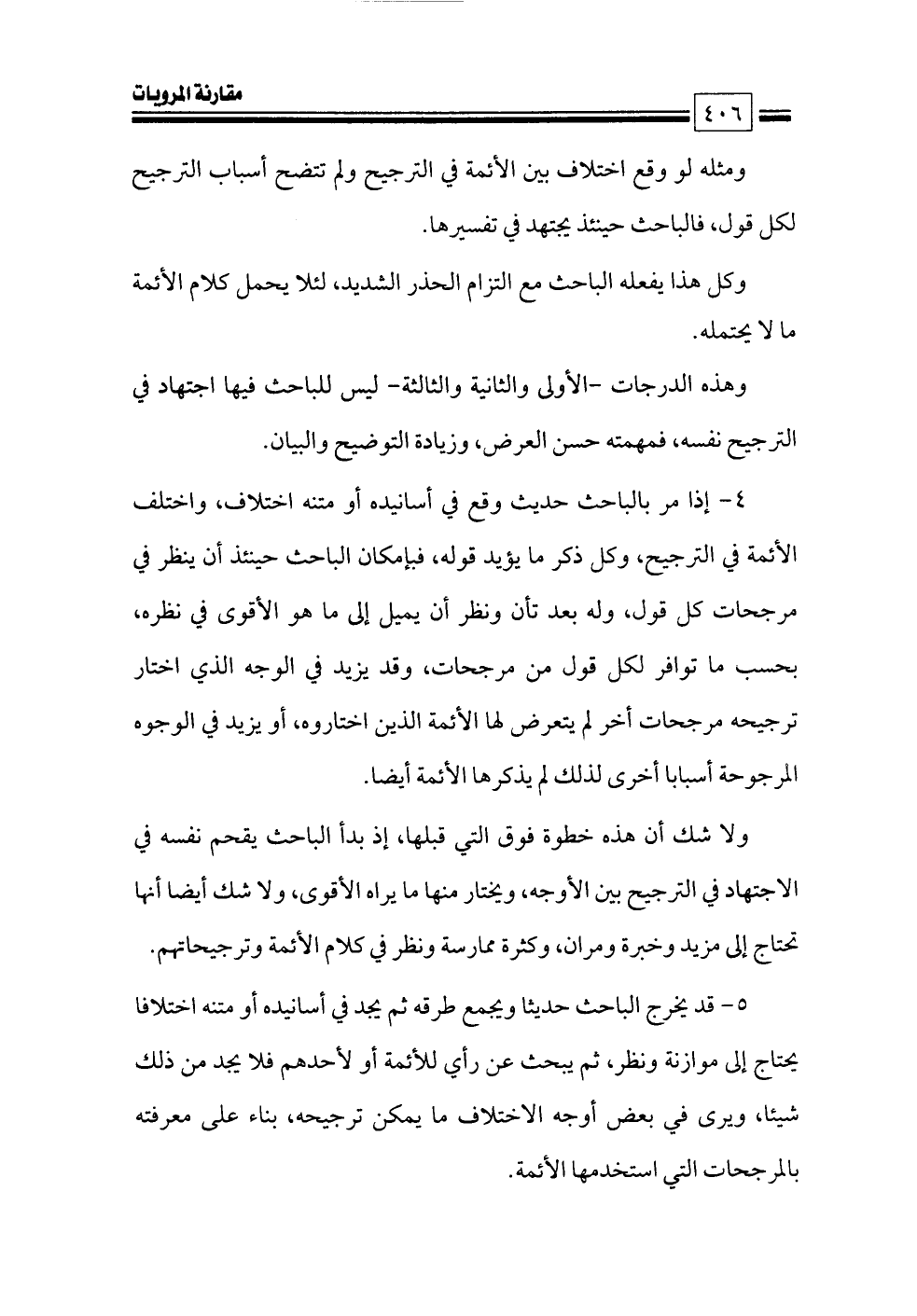 ٤ - إذا مر بالباحث حديث وقع في أسانيده أو متنه اختلاف، واختلف الأئمة في الترجيح، وكل ذكر ما يؤيد قوله، فبإمكان الباحث حينئذ أن ينظر في مرجحات كل قول، وله بعد تأن ونظر أن يميل إلى ما هو الأقوى في نظره، بحسب ما توافر لكل قول من مرجحات، وقد يزيد في الوجه الذي اختار ترجيحه مرجحات أخر لم يتعرض لها الأئمة الذين اختاروه، أو يزيد في الوجوه المرجوحة أسبابا أخرى لذلك لم يذكرها الأئمة أيضا.