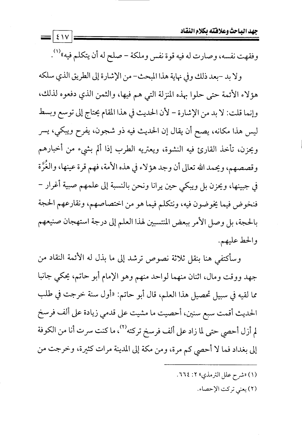 وسأكتفي هنا بنقل ثلاثة نصوص ترشد إلى ما بذله الأئمة النقاد من جهد ووقت ومال، اثنان منهما لواحد منهم وهو الإمام أبو حاتم، يحكي جانبا مما لقيه في سبيل تحصيل هذا العلم، قال أبو حاتم: «أول سنة خرجت في طلب الحديث أقمت سبع سنين، أحصيت ما مشيت على قدمي زيادة على ألف فرسخ لم أزل أحصي حتى لما زاد على ألف فرسخ تركته (¬٢)، ما كنت سرت أنا من الكوفة إلى بغداد فما لا أحصي كم مرة، ومن مكة إلى المدينة مرات كثيرة، وخرجت من