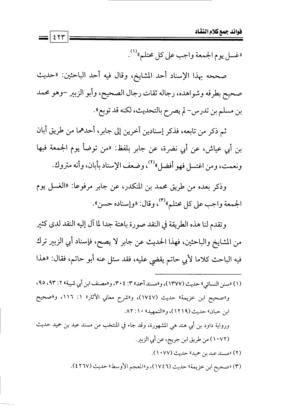 وذكر بعده من طريق محمد بن المنكدر، عن جابر مرفوعا: «الغسل يوم الجمعة واجب على كل محتلم» (¬٣)، وقال: «وإسناده حسن».