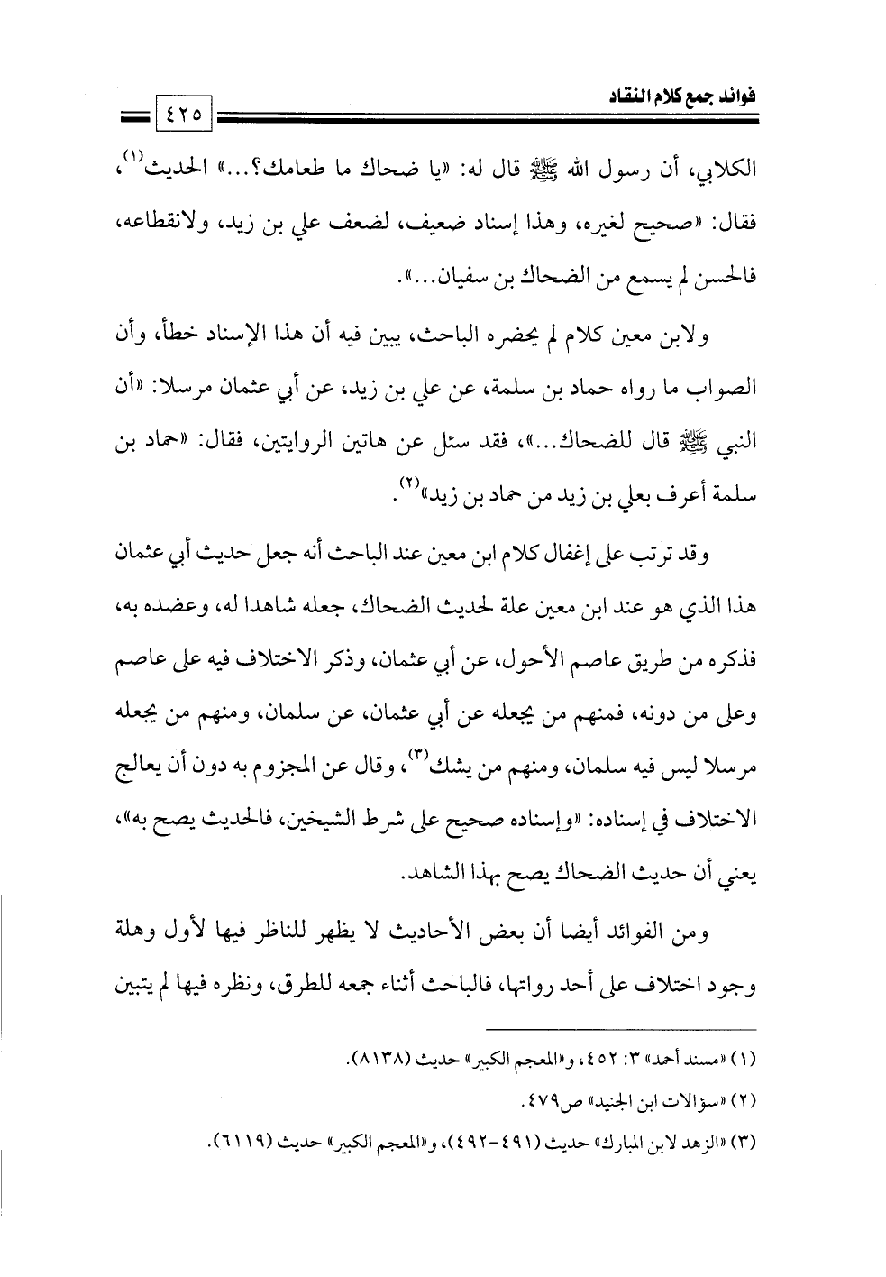 ولابن معين كلام لم يحضره الباحث، يبين فيه أن هذا الإسناد خطأ، وأن الصواب ما رواه حماد بن سلمة، عن علي بن زيد، عن أبي عثمان مرسلا: «أن النبي - صلى الله عليه وسلم - قال للضحاك ... »، فقد سئل عن هاتين الروايتين، فقال: «حماد بن سلمة أعرف بعلي بن زيد من حماد بن زيد» (¬٢).