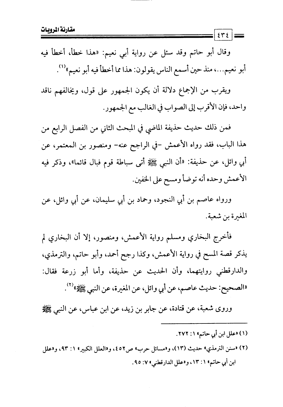 فأخرج البخاري ومسلم رواية الأعمش، ومنصور، إلا أن البخاري لم يذكر قصة المسح في رواية الأعمش، وكذا رجح أحمد، وأبو حاتم، والترمذي، والدارقطني روايتهما، وأن الحديث عن حذيفة، وأما أبو زرعة فقال: «الصحيح: حديث عاصم، عن أبي وائل، عن المغيرة، عن النبي - صلى الله عليه وسلم -» (¬٢).