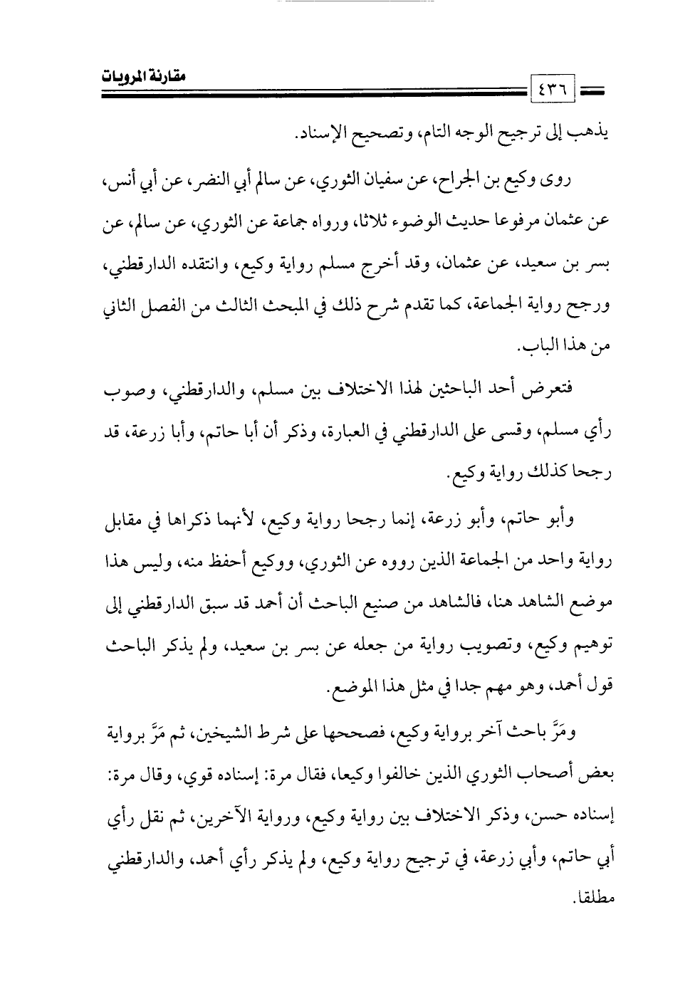 ومَرَّ باحث آخر برواية وكيع، فصححها على شرط الشيخين، ثم مَرَّ برواية بعض أصحاب الثوري الذين خالفوا وكيعا، فقال مرة: إسناده قوي، وقال مرة: إسناده حسن، وذكر الاختلاف بين رواية وكيع، ورواية الآخرين، ثم نقل رأي أبي حاتم، وأبي زرعة، في ترجيح رواية وكيع، ولم يذكر رأي أحمد، والدارقطني مطلقا.