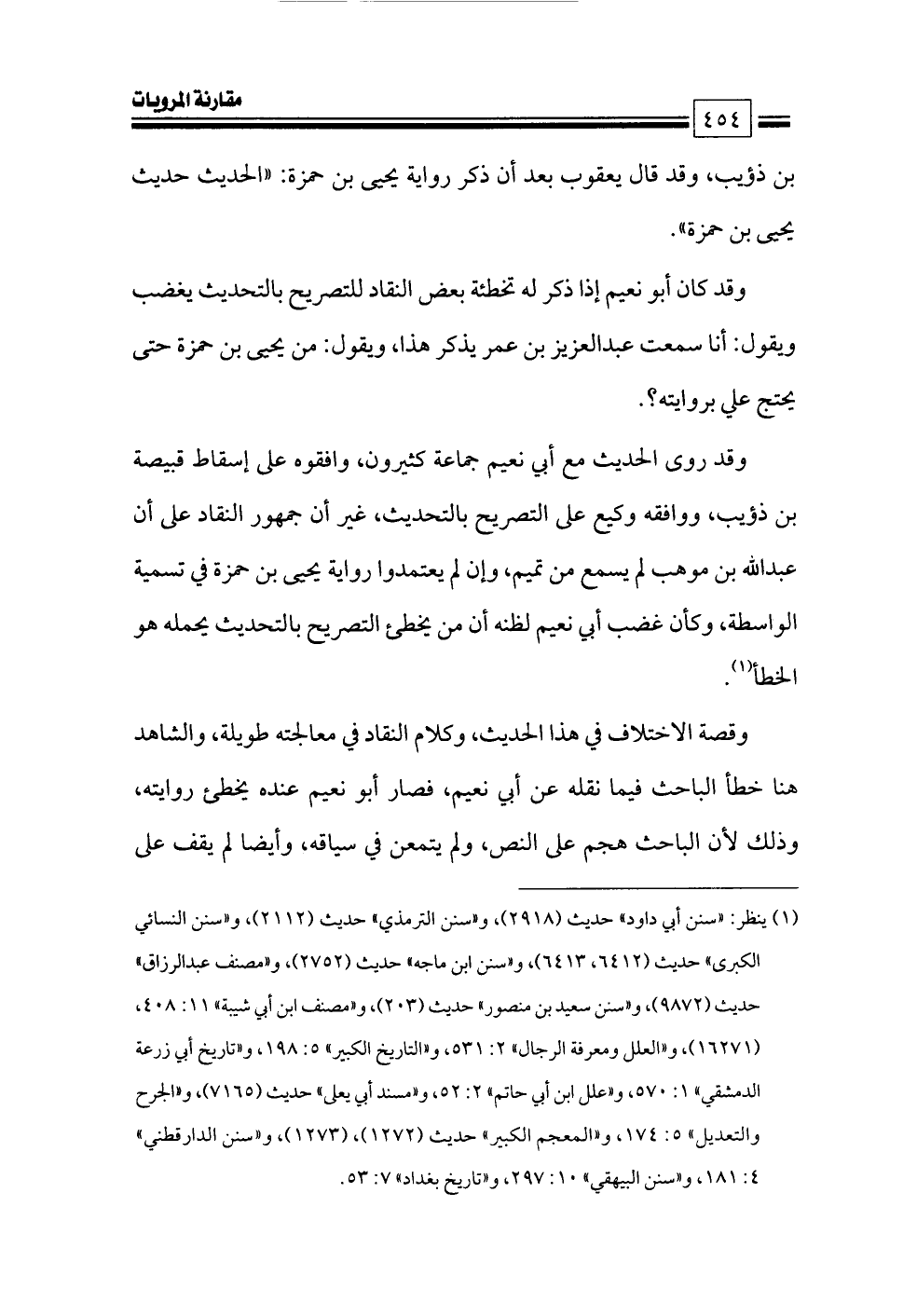 وقد روى الحديث مع أبي نعيم جماعة كثيرون، وافقوه على إسقاط قبيصة بن ذؤيب، ووافقه وكيع على التصريح بالتحديث، غير أن جمهور النقاد على أن عبدالله بن موهب لم يسمع من تميم، وإن لم يعتمدوا رواية يحيى بن حمزة في تسمية الواسطة، وكأن غضب أبي نعيم لظنه أن من يخطئ التصريح بالتحديث يحمله هو الخطأ (¬١).