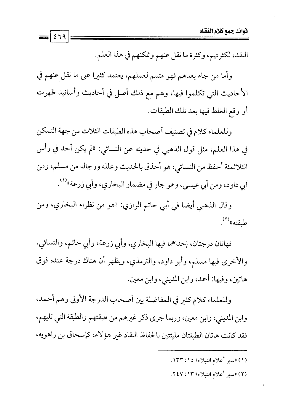 وللعلماء كلام في تصنيف أصحاب هذه الطبقات الثلاث من جهة التمكن في هذا العلم، مثل قول الذهبي في حديثه عن النسائي: «لم يكن أحد في رأس الثلاثمئة أحفظ من النسائي، هو أحذق بالحديث وعلله ورجاله من مسلم، ومن أبي داود، ومن أبي عيسى، وهو جار في مضمار البخاري، وأبي زرعة» (¬١).