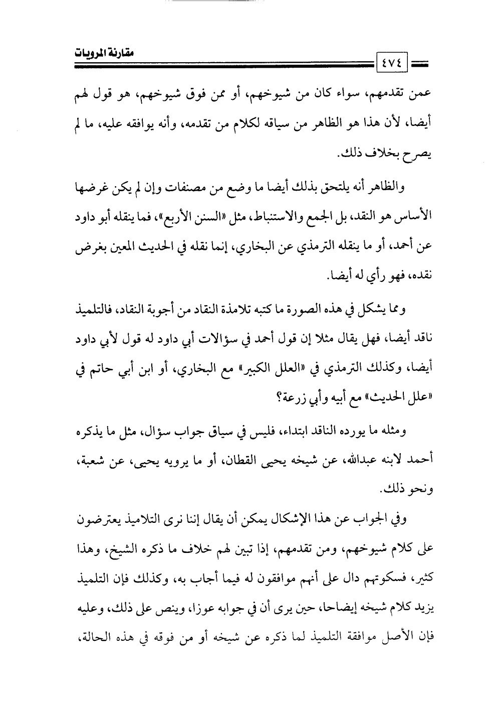 ومما يشكل في هذه الصورة ما كتبه تلامذة النقاد من أجوبة النقاد، فالتلميذ ناقد أيضا، فهل يقال مثلا إن قول أحمد في سؤالات أبي داود له قول لأبي داود أيضا، وكذلك الترمذي في «العلل الكبير» مع البخاري، أو ابن أبي حاتم في «علل الحديث» مع أبيه وأبي زرعة؟