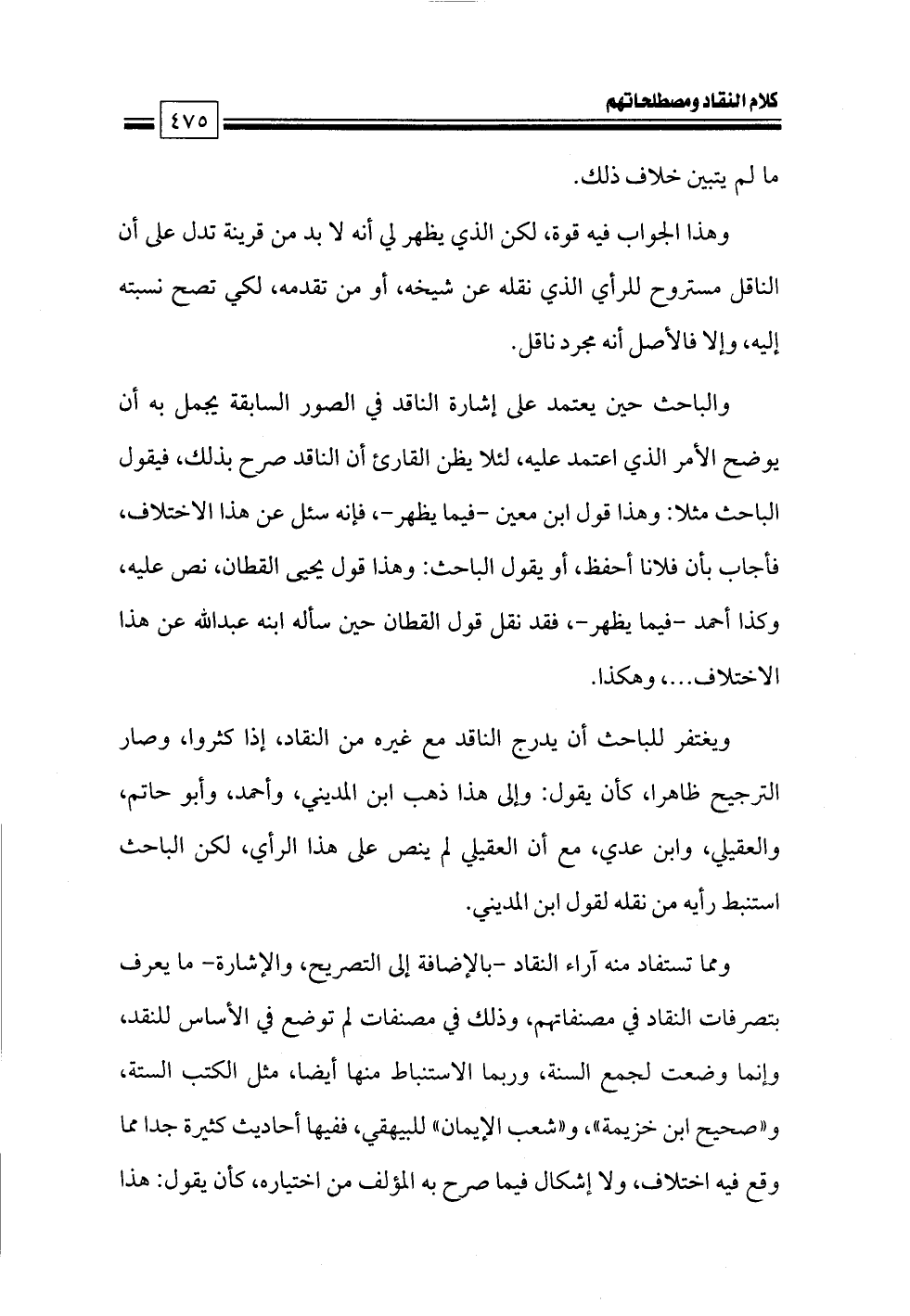 ويغتفر للباحث أن يدرج الناقد مع غيره من النقاد، إذا كثروا، وصار الترجيح ظاهرا، كأن يقول: وإلى هذا ذهب ابن المديني، وأحمد، وأبو حاتم، والعقيلي، وابن عدي، مع أن العقيلي لم ينص على هذا الرأي، لكن الباحث استنبط رأيه من نقله لقول ابن المديني.