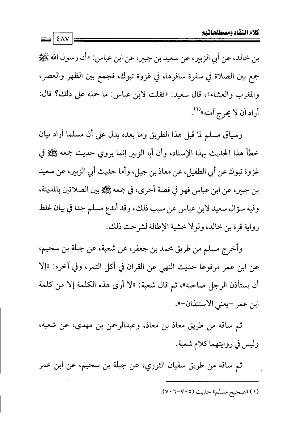 وسياق مسلم لما قبل هذا الطريق وما بعده يدل على أن مسلما أراد بيان خطأ هذا الحديث بهذا الإسناد، وأن أبا الزبير إنما يروي حديث جمعه - صلى الله عليه وسلم - في غزوة تبوك عن أبي الطفيل، عن معاذ بن جبل، وأما حديث أبي الزبير، عن سعيد بن جبير، عن ابن عباس فهو في قصة أخرى، في جمعه - صلى الله عليه وسلم - بين الصلاتين بالمدينة، وفيه سؤال سعيد لابن عباس عن سبب ذلك، وقد أبدع مسلم جدا في بيان غلط رواية قرة بن خالد، ولولا خشية الإطالة لشرحت ذلك.