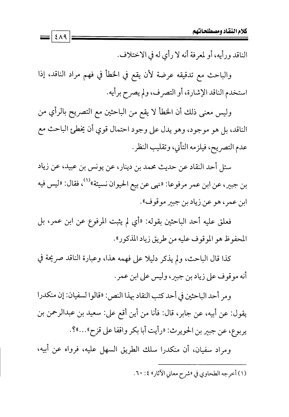 ومر أحد الباحثين في أحد كتب النقاد بهذا النص: «قالوا لسفيان: إن منكدرا يقول: عن أبيه، عن جابر، قال: فأنا من أين أقع على: سعيد بن عبدالرحمن بن يربوع، عن جبير بن الحويرث: «رأيت أبا بكر واقفا على قزح» ... »؟ .