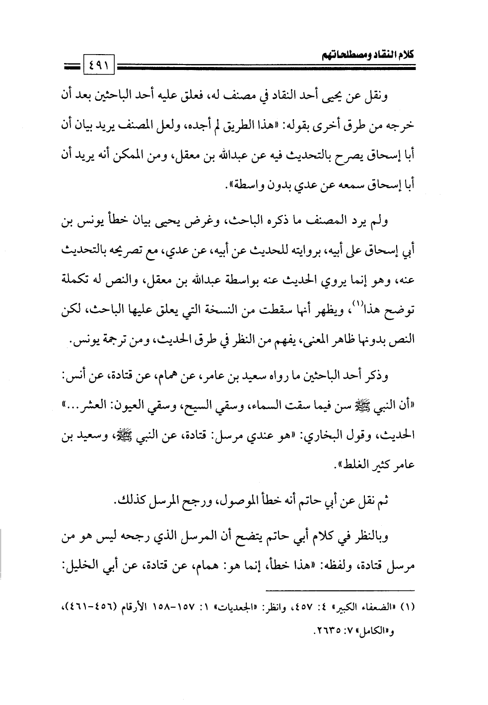 ولم يرد المصنف ما ذكره الباحث، وغرض يحيى بيان خطأ يونس بن أبي إسحاق على أبيه، بروايته للحديث عن أبيه، عن عدي، مع تصريحه بالتحديث عنه، وهو إنما يروي الحديث عنه بواسطة عبدالله بن معقل، والنص له تكملة توضح هذا (¬١)، ويظهر أنها سقطت من النسخة التي يعلق عليها الباحث، لكن النص بدونها ظاهر المعنى، يفهم من النظر في طرق الحديث، ومن ترجمة يونس.