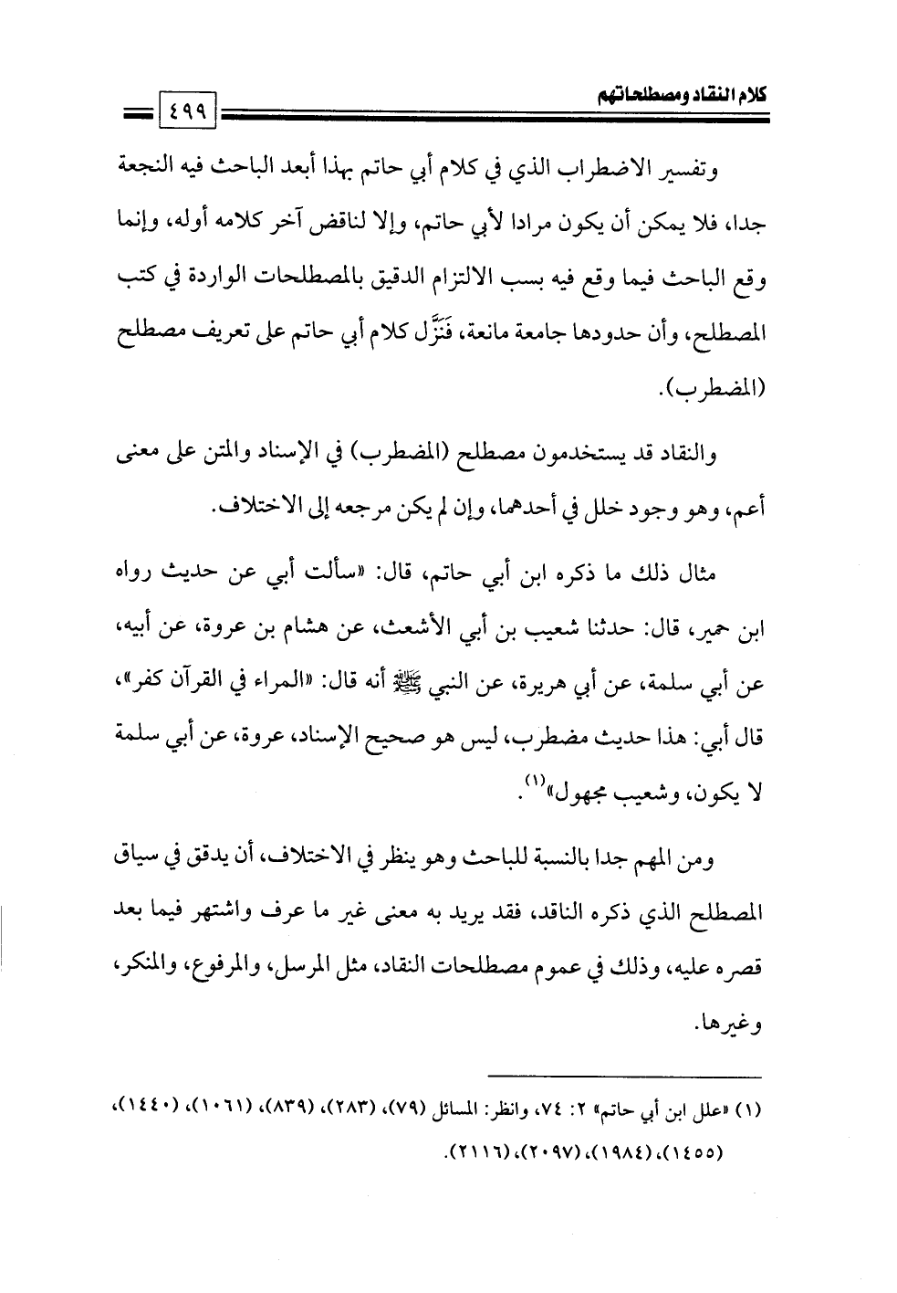 وتفسير الاضطراب الذي في كلام أبي حاتم بهذا أبعد الباحث فيه النجعة جدا، فلا يمكن أن يكون مرادا لأبي حاتم، وإلا لناقض آخر كلامه أوله، وإنما وقع الباحث فيما وقع فيه بسب الالتزام الدقيق بالمصطلحات الواردة في كتب المصطلح، وأن حدودها جامعة مانعة، فَنَزَّل كلام أبي حاتم على تعريف مصطلح (المضطرب).