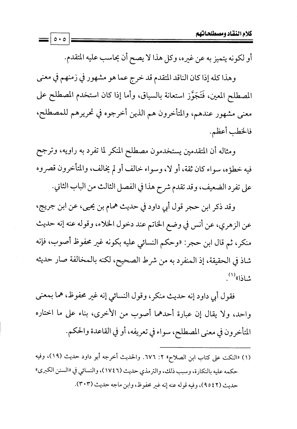 فقول أبي داود إنه حديث منكر، وقول النسائي إنه غير محفوظ، هما بمعنى واحد، ولا يقال إن عبارة أحدهما أصوب من الأخرى، بناء على ما اختاره المتأخرون في معنى المصطلح، سواء في تعريفه، أو في القاعدة والحكم.