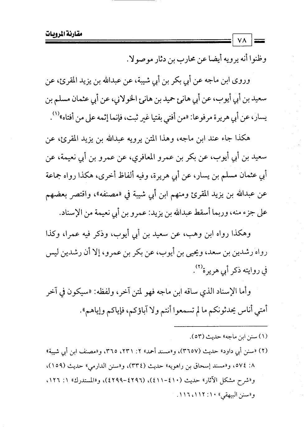 وروى ابن ماجه عن أبي بكر بن أبي شيبة, عن عبدالله بن يزيد المقرئ, عن سعيد بن أبي أيوب, عن أبي هانئ حميد بن هانئ الخولاني, عن أبي عثمان مسلم بن يسار, عن أبي هريرة مرفوعا: «من أفتي بفتيا غير ثبت, فإنما إثمه على من أفتاه» (¬١).