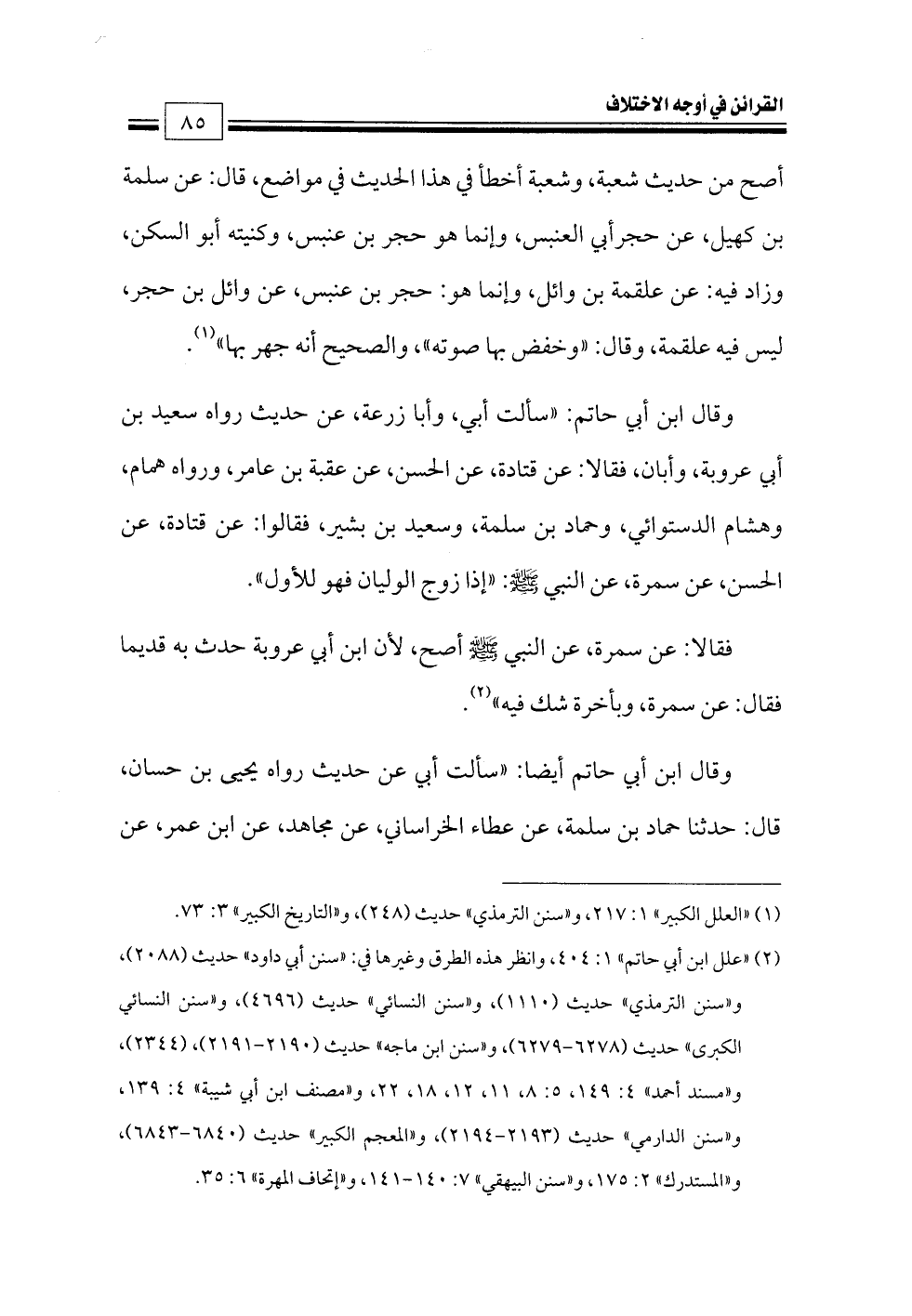 (¬٢) «علل ابن أبي حاتم» ١: ٤٠٤، وانظر هذه الطرق وغيرها في: «سنن أبي داود» حديث (٢٠٨٨)، و «سنن الترمذي» حديث (١١١٠)، و «سنن النسائي» حديث (٤٦٩٦)، و «سنن النسائي الكبرى» حديث (٦٢٧٨ - ٦٢٧٩)، و «سنن ابن ماجه» حديث (٢١٩٠ - ٢١٩١)، (٢٣٤٤)، و «مسند أحمد» ٤: ١٤٩، ٥: ٨، ١١، ١٢، ١٨، ٢٢، و «مصنف ابن أبي شيبة» ٤: ١٣٩، و «سنن الدارمي» حديث (٢١٩٣ - ٢١٩٤)، و «المعجم الكبير» حديث (٦٨٤٠ - ٦٨٤٣)، و «المستدرك» ٢: ١٧٥، و «سنن البيهقي» ٧: ١٤٠ - ١٤١، و «إتحاف المهرة» ٦: ٣٥.