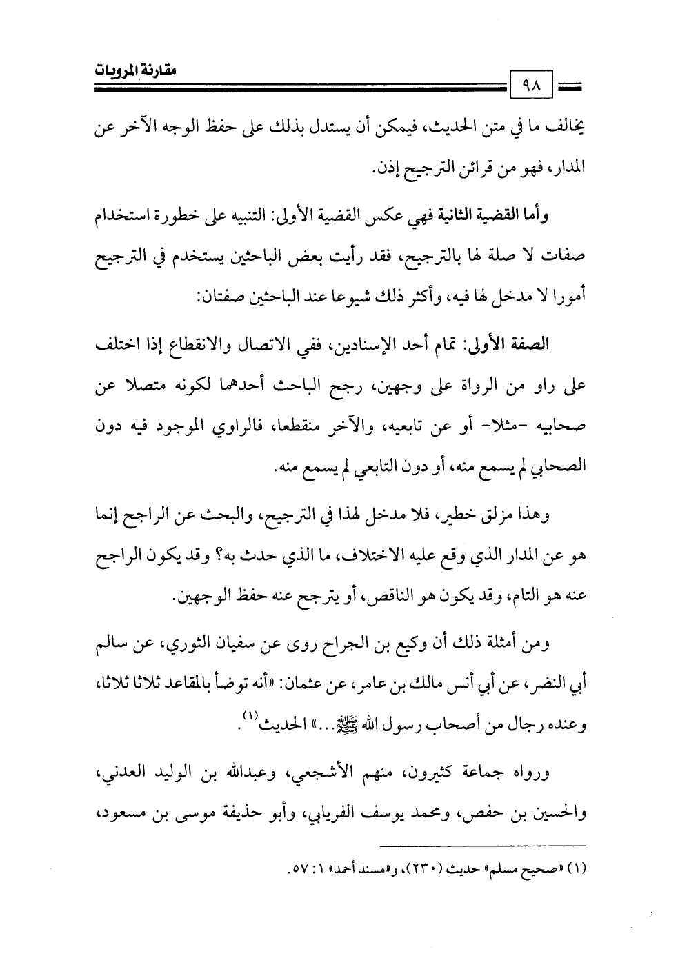 وهذا مزلق خطير، فلا مدخل لهذا في الترجيح, والبحث عن الراجح إنما هو عن المدار الذي وقع عليه الاختلاف، ما الذي حدث به؟ وقد يكون الراجح عنه هو التام, وقد يكون هو الناقص، أو يترجح عنه حفظ الوجهين.
