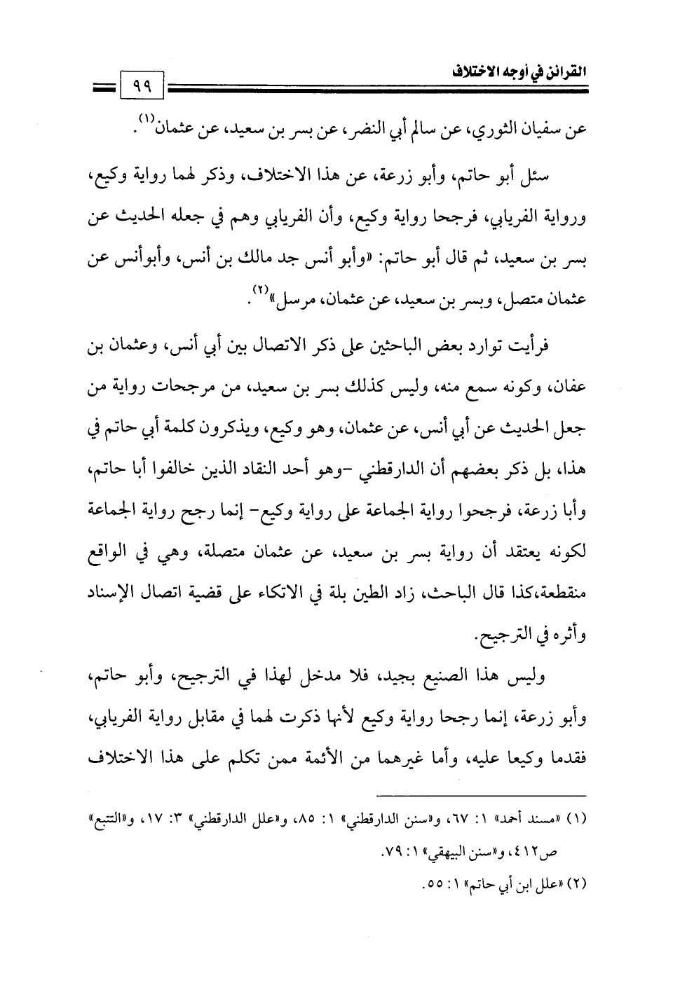 فرأيت توارد بعض الباحثين على ذكر الاتصال بين أبي أنس، وعثمان بن عفان، وكونه سمع منه, وليس كذلك بسر بن سعيد، من مرجحات رواية من جعل الحديث عن أبي أنس, عن عثمان, وهو وكيع, ويذكرون كلمة أبي حاتم في هذا, بل ذكر بعضهم أن الدارقطني -وهو أحد النقاد الذين خالفوا أبا حاتم, وأبا زرعة, فرجحوا رواية الجماعة على رواية وكيع- إنما رجح رواية الجماعة لكونه يعتقد أن رواية بسر بن سعيد, عن عثمان متصلة, وهي في الواقع منقطعة, كذا قال الباحث, زاد الطين بلة في الاتكاء على قضية اتصال الإسناد وأثره في الترجيح.