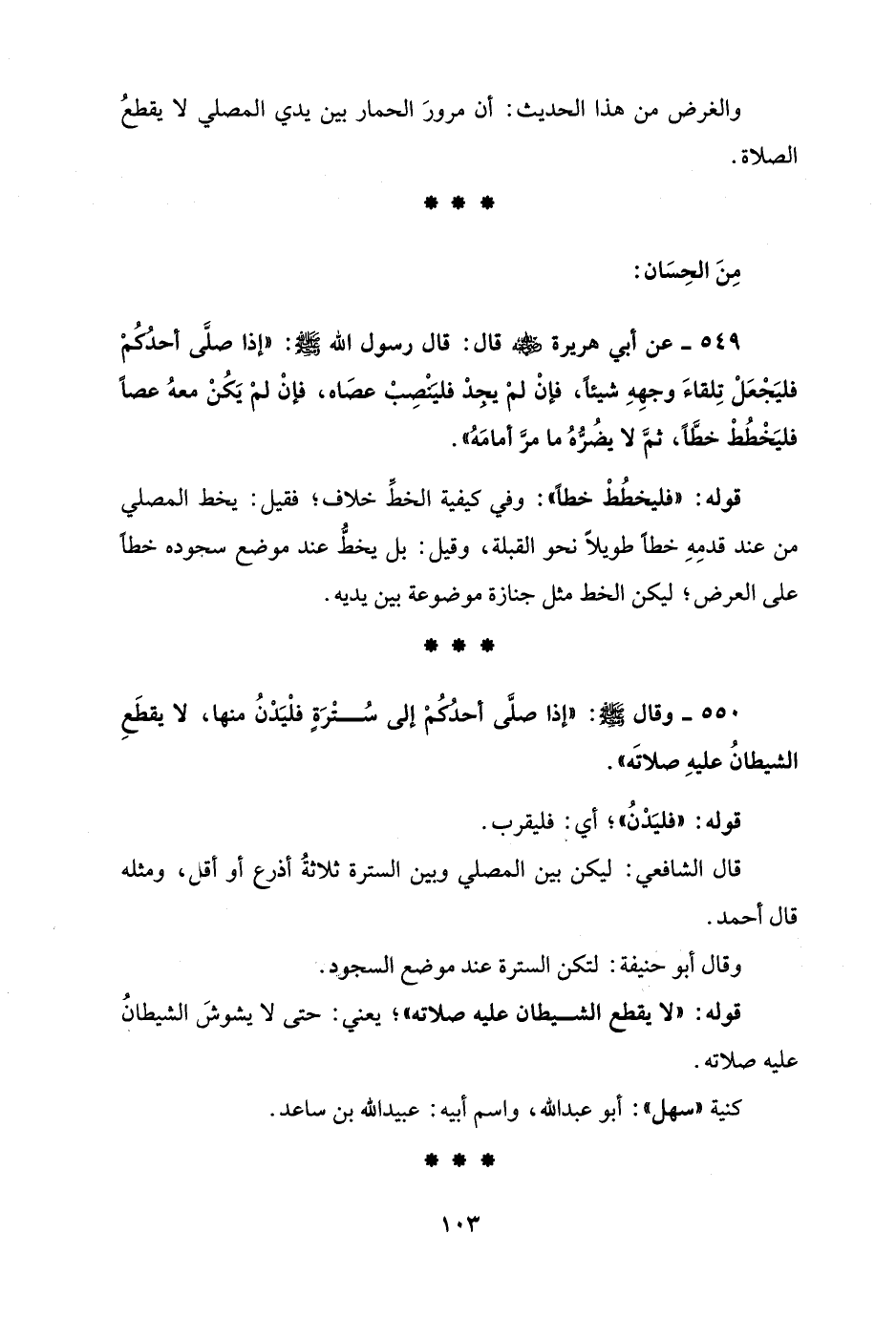 549 - عن أبي هريرة - رضي الله عنه - قال: قال رسول الله - صلى الله عليه وسلم -: "إذا صلَّى أحدُكُم فليَجْعَلْ تِلقاءَ وجهِهِ شيئًا، فانْ لمْ يجدْ فليَنْصِبْ عصَاه، فإنْ لمْ يَكُنْ معهُ عصًا فليَخْطُطْ خطًّا، ثمَّ لا يضُرُّهُ ما مرَّ أمامَهُ".