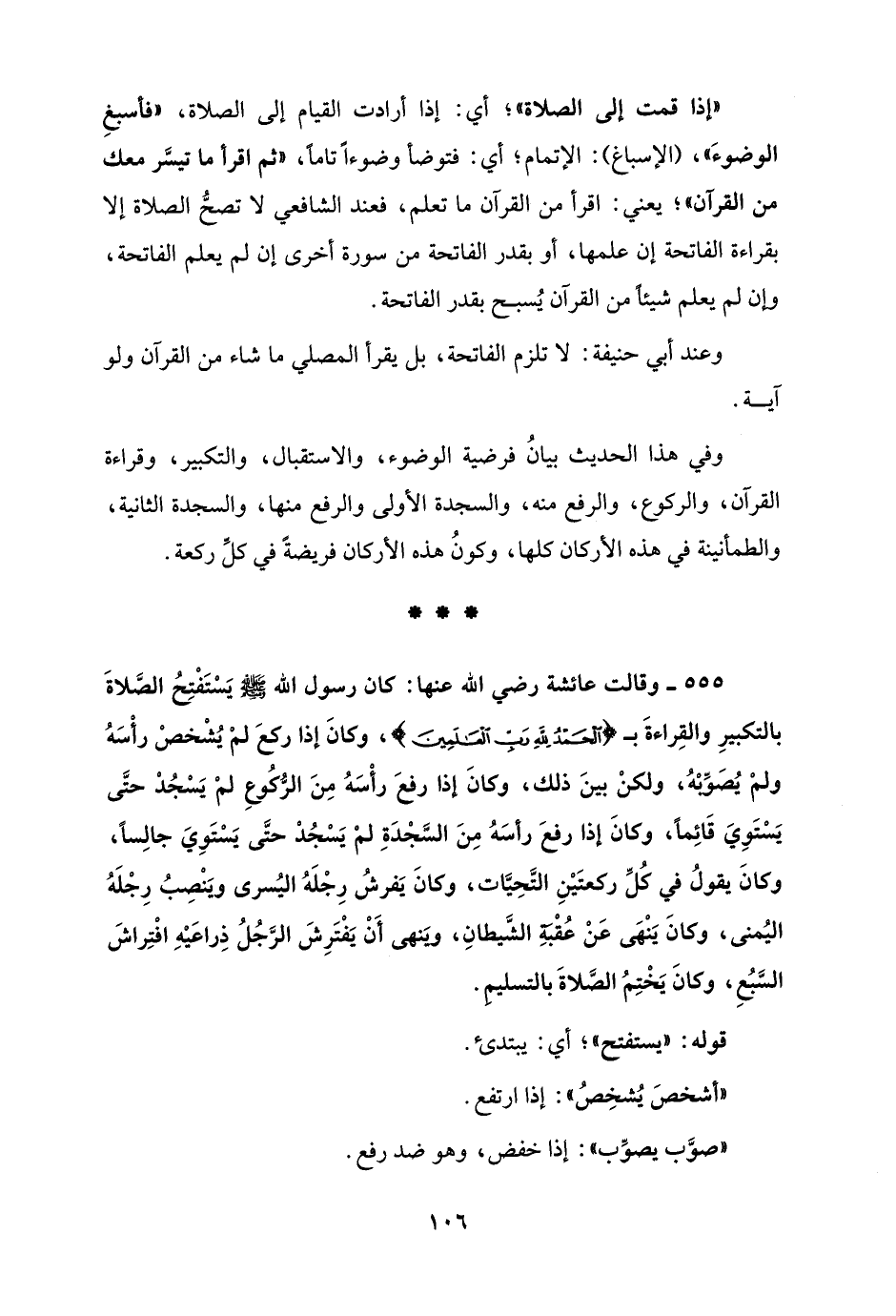 555 - وقالت عائشة رضي الله عنها: كان رسول الله - صلى الله عليه وسلم - يَسْتَفْتِحُ الصَّلاةَ بالتكبيرِ والقِراءةَ بـ {الْحَمْدُ لِلَّهِ رَبِّ الْعَالَمِينَ}، وكانَ إذا ركعَ لمْ يُشْخصْ رأْسَهُ ولمْ يُصَوِّبْهُ، ولكنْ بينَ ذلك، وكانَ إذا رفعَ رأْسَهُ مِنَ الرُّكُوعِ لمْ يَسْجُدْ حتَّى يَسْتَوِيَ قَائِمًا، وكانَ إذا رفعَ رأسَهُ مِنَ السَّجْدَةِ لمْ يَسْجُدْ حتَّى يَسْتَوِيَ جالِسًا، وكانَ يقولُ في كُلِّ ركعتَيْنِ التَّحِيَّات، وكانَ يَفرشُ رِجْلَهُ اليُسرى ويَنْصِبُ رِجْلَهُ اليُمنى، وكانَ يَنْهَى عَنْ عُقْبَةِ الشَّيطانِ، ويَنهى أَنْ يَفْتَرِشَ الرَّجُلُ ذِراعَيْهِ افْتِراشَ السَّبُعِ، وكانَ يَخْتِمُ الصَّلاةَ بالتسليمِ.
