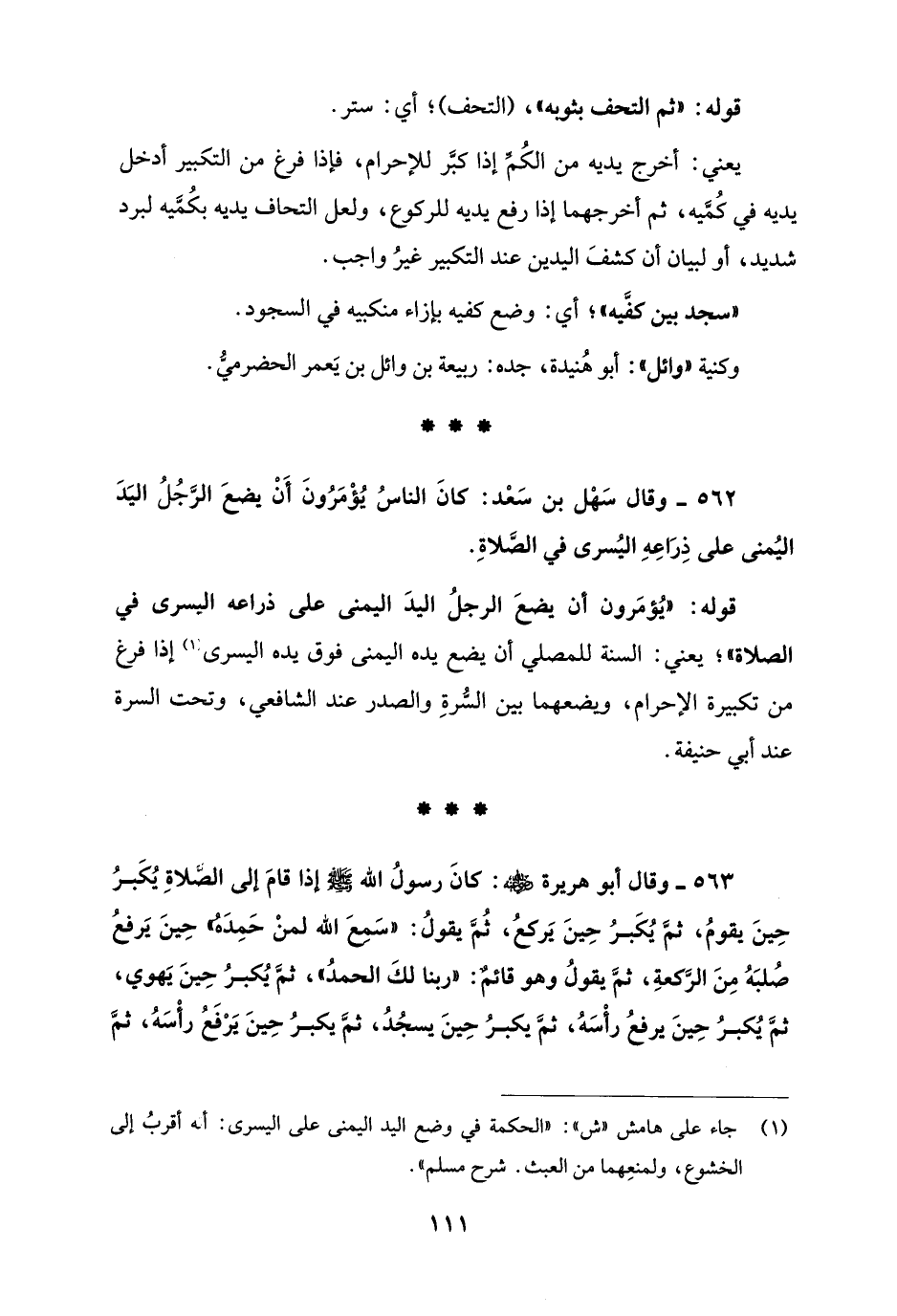 562 - وقال سَهْل بن سَعْد: كانَ النَّاسُ يُؤْمَرُونَ أَنْ يضعَ الرَّجُلُ اليَدَ اليُمنى على ذِرَاعِهِ اليُسرى في الصَّلاةِ.