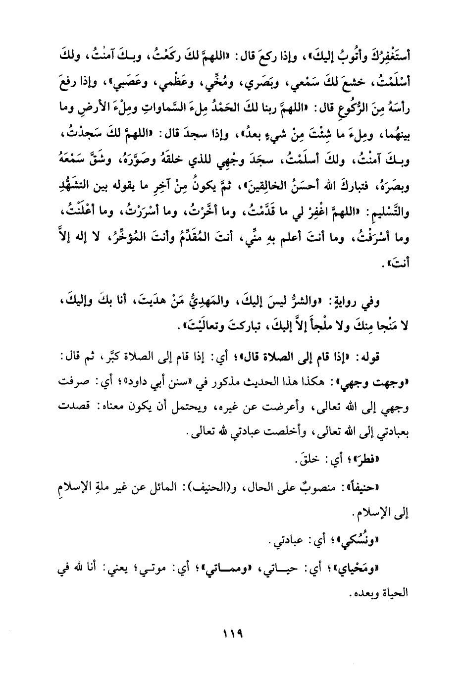 وفي روايةٍ: "والشرُّ ليسَ إليكَ، والمَهدِيُّ مَنْ هدَيتَ، أنا بكَ وإليكَ، لا مَنْجا مِنكَ ولا ملْجأَ إلَّا إليكَ، تباركتَ وتعالَيْتَ".