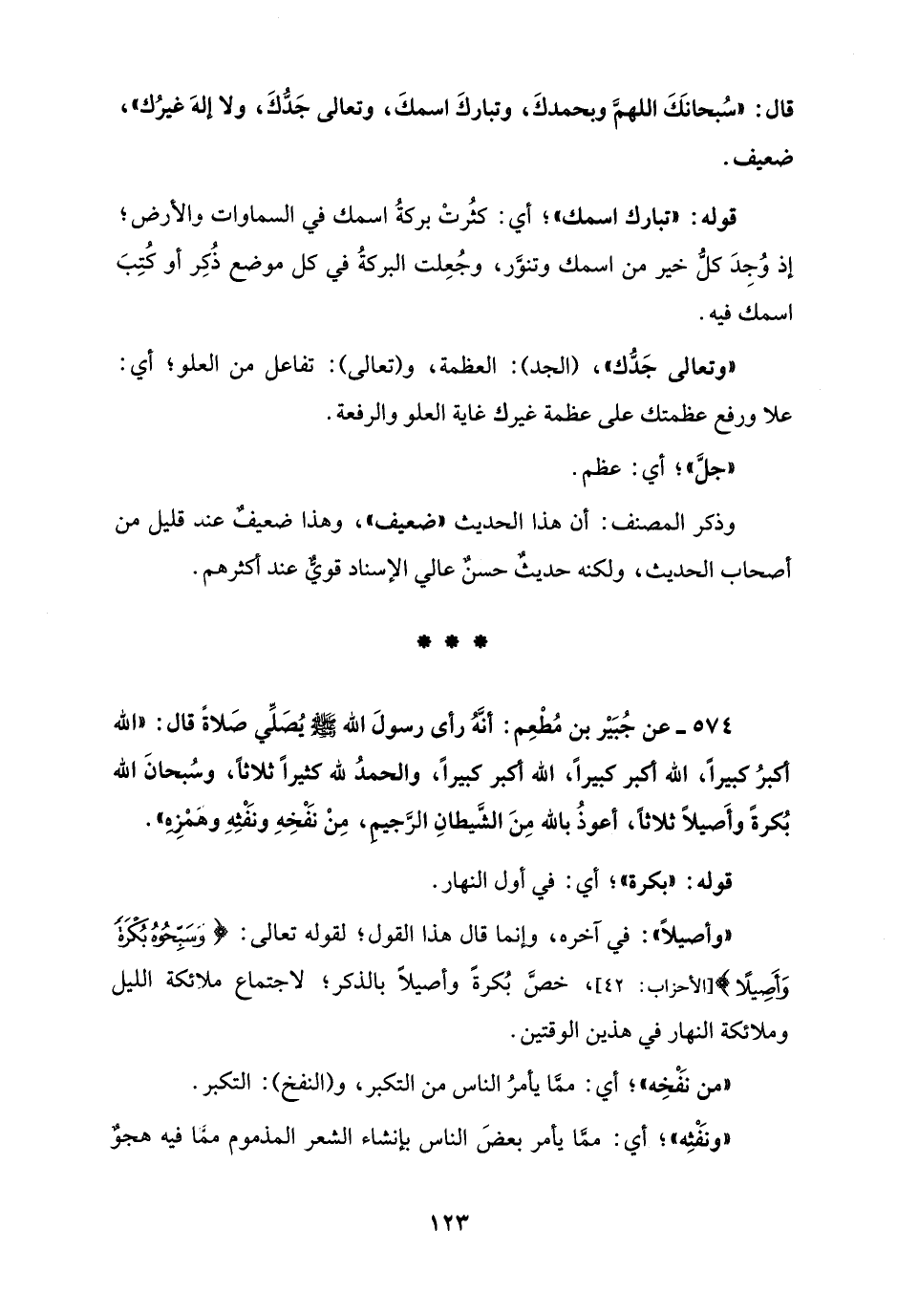574 - عن جُبَيْر بن مُطْعِم: أنَّهُ رأى رسولَ الله - صلى الله عليه وسلم - يُصَلِّي صَلاةً قال: "الله أكبرُ كبيرًا، الله أكبر كبيرًا، الله أكبر كبيرًا، والحمدُ لله كثيرًا ثلاثًا، وسُبحانَ الله بُكرةً وأَصيلًا ثلاثًا، أعوذُ بالله مِنَ الشَّيطانِ الرَّجيمِ، مِنْ نَفْخِهِ ونَفْثِهِ وهَمْزِهِ".