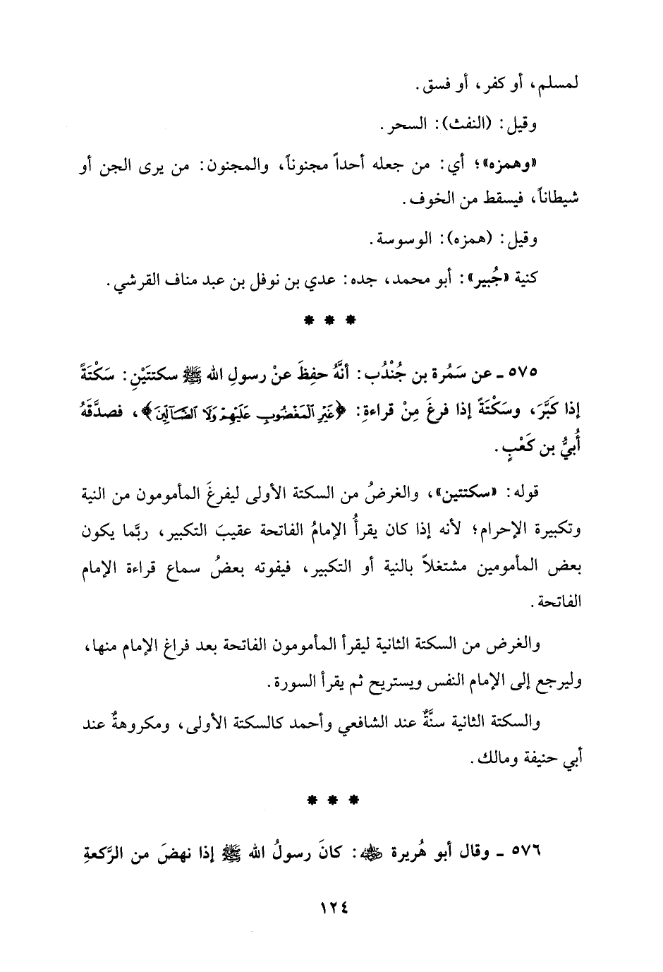 575 - عن سَمُرة بن جُنْدُب: أنَّهُ حفِظَ عنْ رسولِ الله - صلى الله عليه وسلم - سكتتَيْنِ: سَكْتَةً إذا كَبَّرَ، وسَكْتَةً إذا فرغَ مِنْ قراءةِ: {غَيْرِ الْمَغْضُوبِ عَلَيْهِمْ وَلَا الضَّالِّينَ}، فصدَّقَهُ أُبيُّ بن كَعْبٍ.