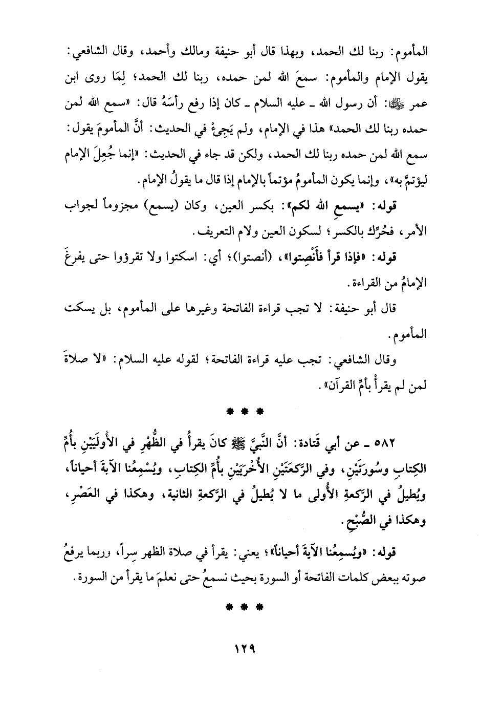 582 - عن أبي قَتادة: أنَّ النَّبيَّ - صلى الله عليه وسلم - كانَ يقرأُ في الظُّهْرِ في الأُولَيَيْنِ بأُمِّ الكِتابِ وسُورتَيْنِ، وفي الرَّكعَتَيْنِ الأُخْرَيَيْنِ بأُمِّ الكِتابِ، ويُسْمِعُنا الآيةَ أحيانًا، ويُطيلُ في الرَّكعةِ الأُولى ما لا يُطيلُ في الرَّكعةِ الثانية، وهكذا في العَصْرِ، وهكذا في الصُّبْحِ.