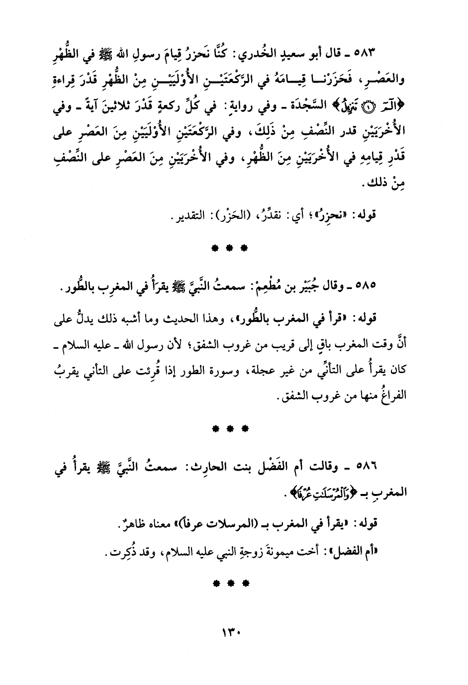583 - قال أبو سعيدٍ الخُدري: كنَّا نَحزرُ قِيامَ رسولِ الله - صلى الله عليه وسلم - في الظُّهْرِ والعَصْرِ، فَحَزَرْنا قِيامَهُ في الرَّكْعَتَيْنِ الأُوْلَيَيْنِ مِنْ الظُّهْرِ قَدْرَ قِراءةِ {الم (1) تَنْزِيلُ} السَّجْدَة - وفي روايةٍ: في كُلِّ ركعةٍ قَدْرَ ثلاثينَ آيةً - وفي الأُخْرَيَيْنِ قدر النِّصْفِ مِنْ ذَلِكَ، وفي الرَّكْعَتَيْنِ الأُوْلَيَيْنِ مِنَ العَصْرِ على قَدْرِ قِيامِهِ في الأخْرَيَيْنِ مِنَ الظُّهْرِ، وفي الأُخْرَيَيْنِ مِنَ العَصْرِ على النِّصْفِ مِنْ ذلك.