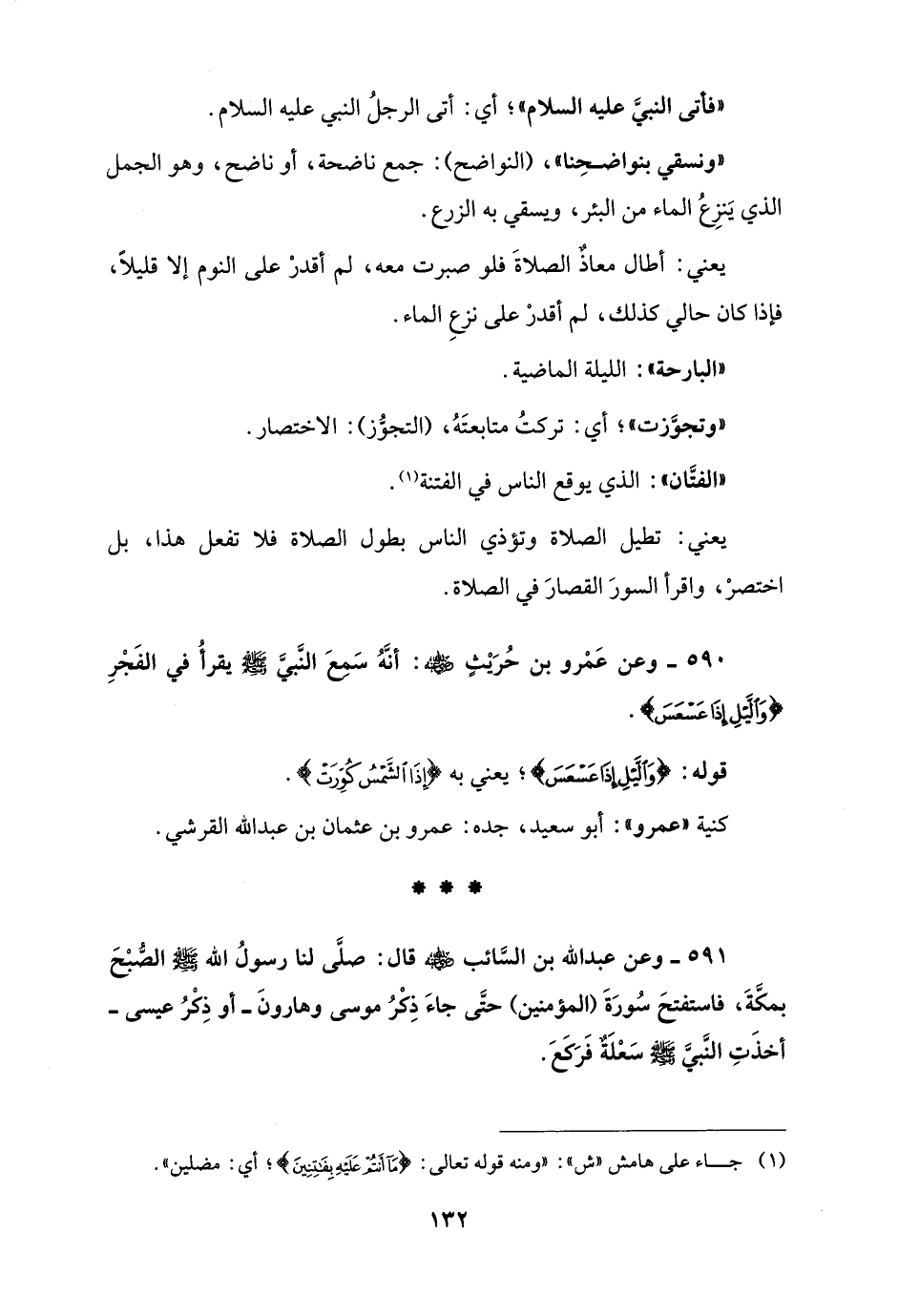 591 - وعن عبد الله بن السَّائب - رضي الله عنه - قال: صلَّى لنا رسولُ الله - صلى الله عليه وسلم - الصُّبْحَ بمكَّةَ، فاستفتحَ سُورَةَ (المؤمنين) حتَّى جاءَ ذِكْرُ موسى وهارونَ - أو ذِكْرُ عيسى - أخذَتِ النَّبيَّ - صلى الله عليه وسلم - سَعْلَةٌ فَرَكَعَ.