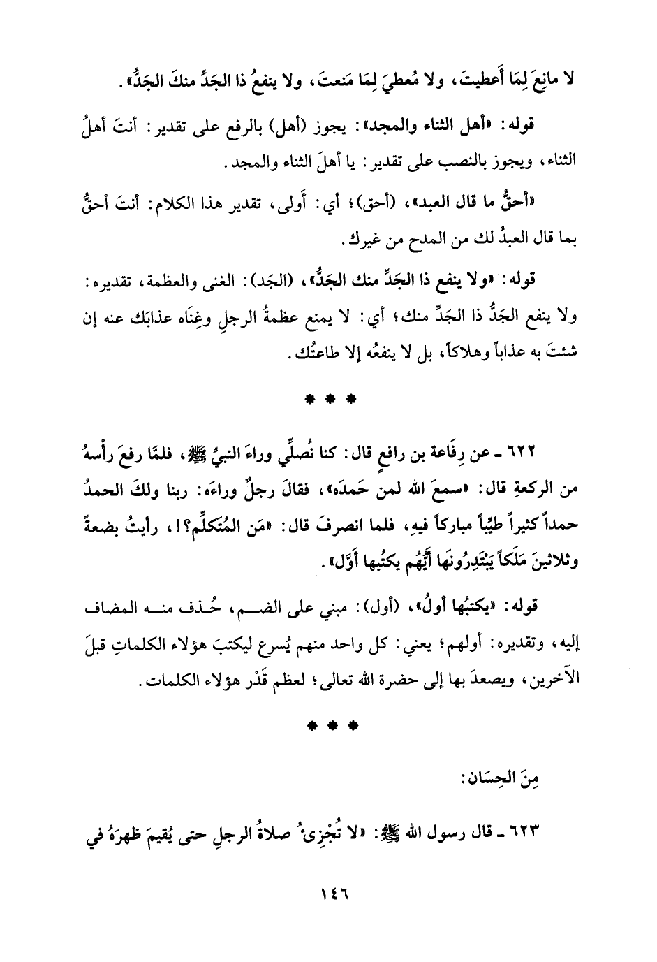 622 - عن رِفَاعة بن رافعٍ قال: كنا نُصلِّي وراءَ النبيِّ - صلى الله عليه وسلم -، فلمَّا رفعَ رأْسهُ من الركعةِ قال: "سمعَ الله لمن حَمدَه"، فقالَ رجلٌ وراءَه: ربنا ولكَ الحمدُ حمدًا كثيرًا طيّبًا مباركًا فيهِ، فلما انصرفَ قال: "مَن المُتَكلِّم؟!، رأيتُ بضعةً وثلاثينَ مَلَكًا يَبْتَدِرُونَها أَيُّهُم يكتُبها أَوَّل".
