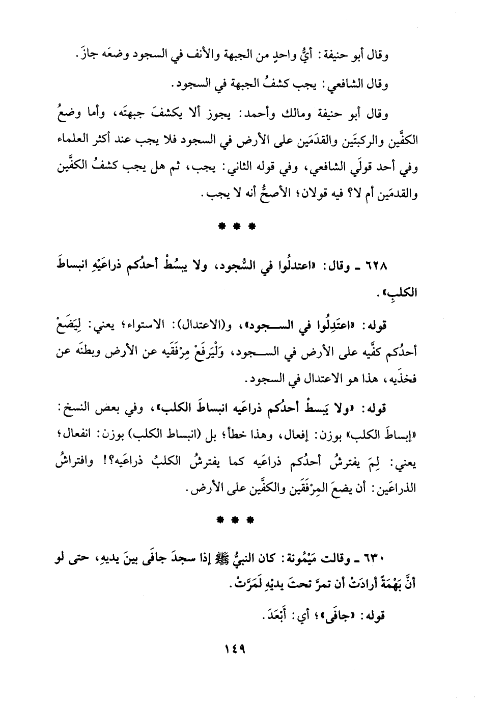 628 - وقال: "اعتدلُوا في السُّجود، ولا يبسُطْ أحدُكم ذراعَيْهِ انبساطَ الكلبِ".