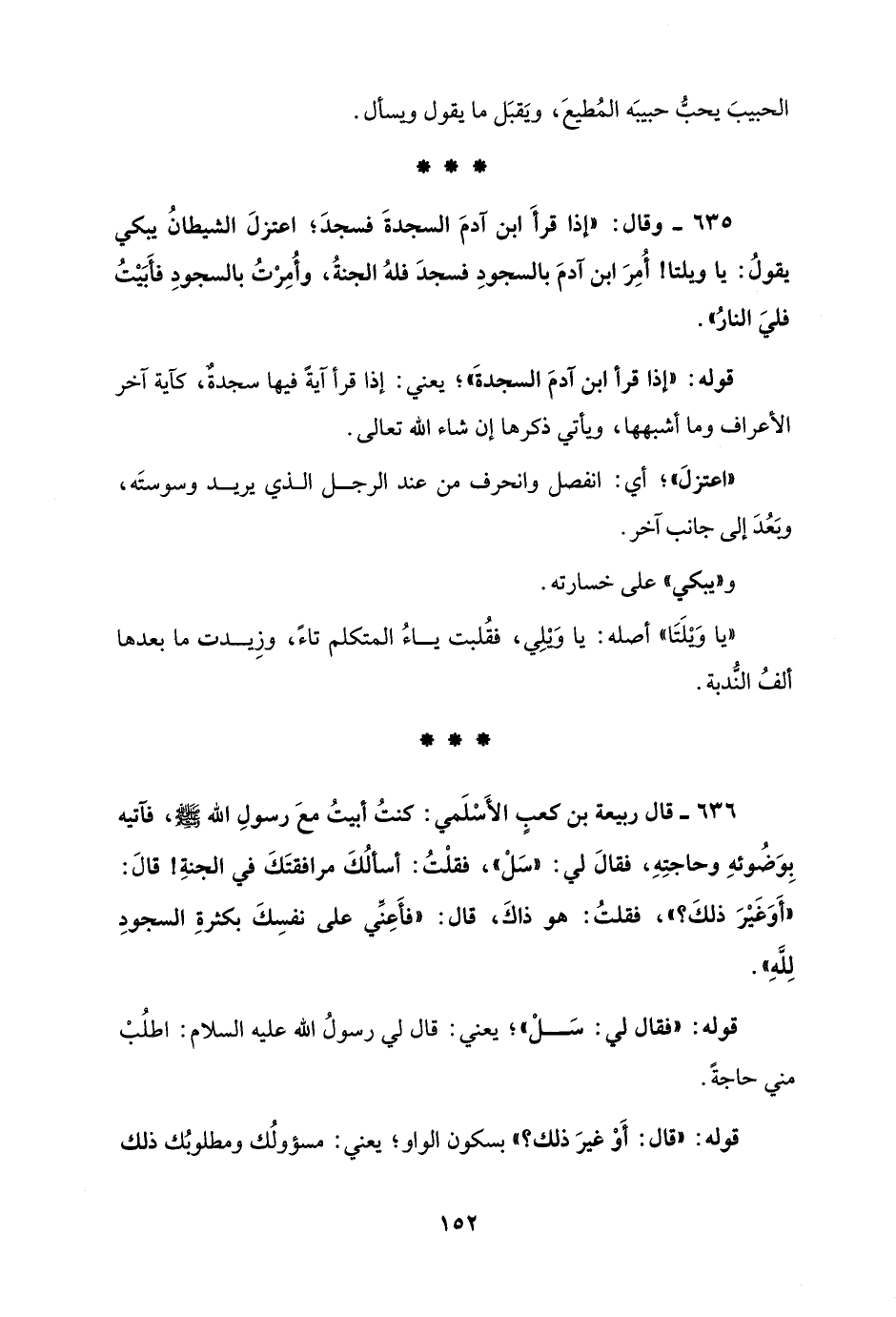 636 - قال ربيعة بن كعبٍ الأَسْلَمي: كنتُ أبيتُ معَ رسولِ الله - صلى الله عليه وسلم -، فآتيه بِوَضُوئهِ وحاجتِهِ، فقالَ لي: "سَلْ"، فقلْتُ: أسألُكَ مرافقتَكَ في الجنةِ! قالَ: "أَوَغَيْرَ ذلكَ؟ "، فقلتُ: هو ذاكَ، فال: "فأَعِنِّي على نفسِكَ بكثرةِ السجودِ لِلَّهِ".