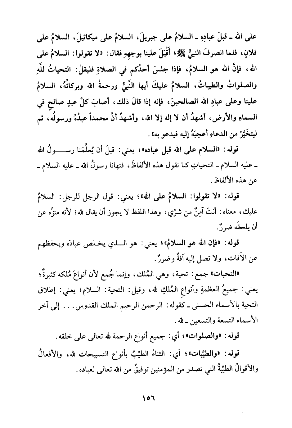 على الله - قبلَ عبادِهِ - السلامُ على جبريلَ، السلامُ على ميكائيلَ، السلامُ على فلانٍ، فلما انصرفَ النبيُّ - صلى الله عليه وسلم -؛ أَقْبَلَ علينا بوجهِهِ فقال: "لا تقولوا: السلامُ على الله، فإنَّ الله هو السلامُ، فإذا جلسَ أحدُكم في الصلاةِ فليقلْ: التحياتُ للَّهِ والصلواتُ والطيباتُ، السلامُ عليكَ أيها النَّبيُّ ورحمةُ الله وبركاتُهُ، السلامُ علينا وعلى عبادِ الله الصالحينَ، فإنه إذا قالَ ذلك، أصابَ كلَّ عبدٍ صالحٍ في السماءِ والأرض، أشهدُ أن لا إله إلا الله، وأشهدُ أنَّ محمدًا عبدُهُ ورسولُه، ثم ليتخَيَّرْ من الدعاءِ أعجبَهُ إليه فيدعو به".