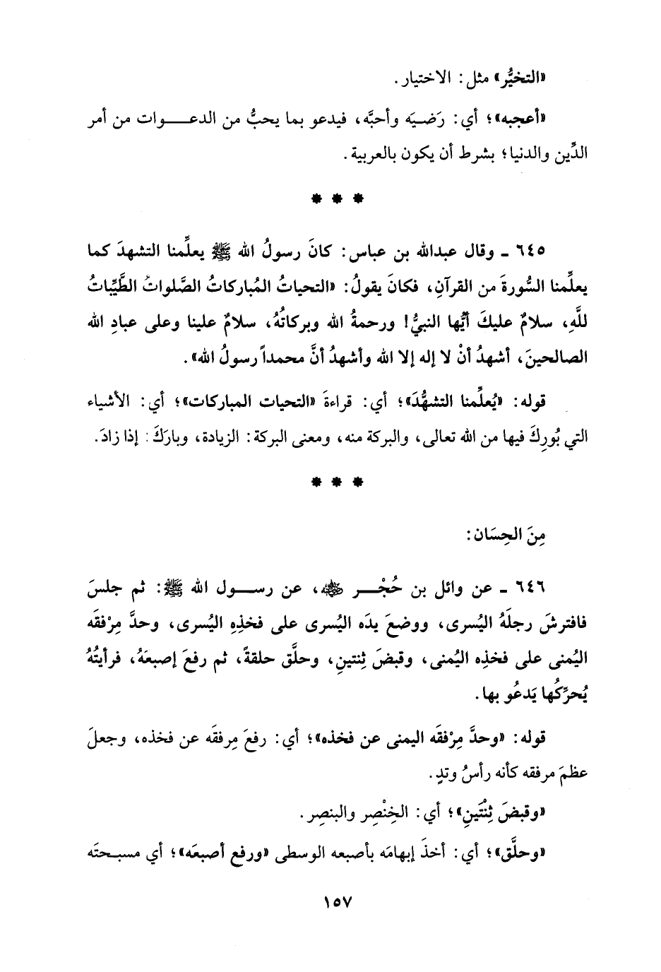 646 - عن وائل بن حُجْر - رضي الله عنه -، عن رسول الله - صلى الله عليه وسلم -: ثم جلسَ فافترشَ رجلَهُ اليُسرى، ووضعَ يدَه اليُسرى على فخذِهِ اليُسرى، وحدَّ مِرْفقَه اليُمنى على فخذِه اليُمنى، وقبضَ ثِنتينِ، وحلَّق حلقةً، ثم رفعَ إصبعَهُ، فرأيتُهُ يُحرِّكُها يَدعُو بها.
