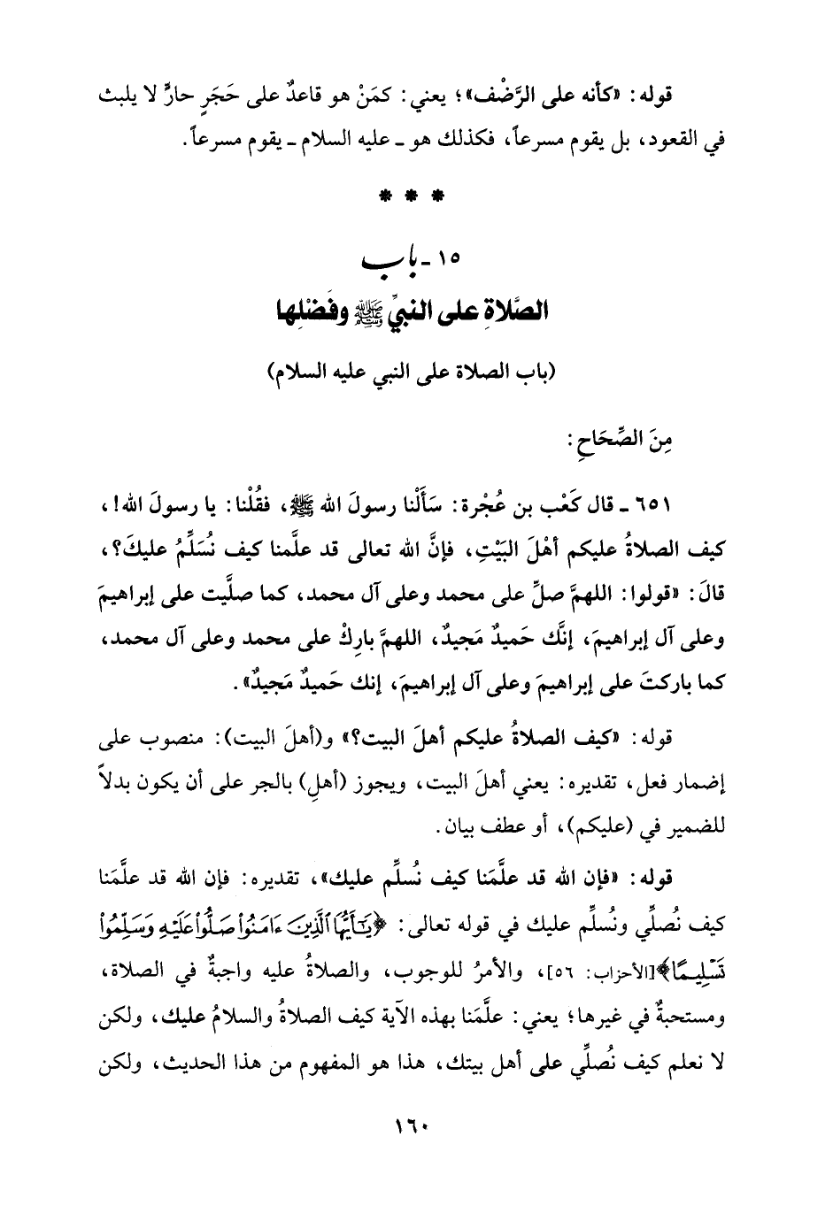 651 - قال كَعْب بن عُجْرة: سَأَلْنا رسولَ الله - صلى الله عليه وسلم -، فقُلْنا: يا رسولَ الله!، كيف الصلاةُ عليكم أهْلَ البَيْتِ، فإنَّ الله تعالى قد علَّمنا كيف نُسَلِّمُ عليكَ؟، قالَ: "قولوا: اللهمَّ صلِّ على محمد وعلى آل محمد، كما صلَّيت على إبراهيمَ وعلى آل إبراهيمَ، إنَّك حَميدٌ مَجيدٌ، اللهمَّ بارِكْ على محمد وعلى آل محمد، كما باركتَ على إبراهيمَ وعلى آل إبراهيمَ، إنك حَميدٌ مَجيدٌ".