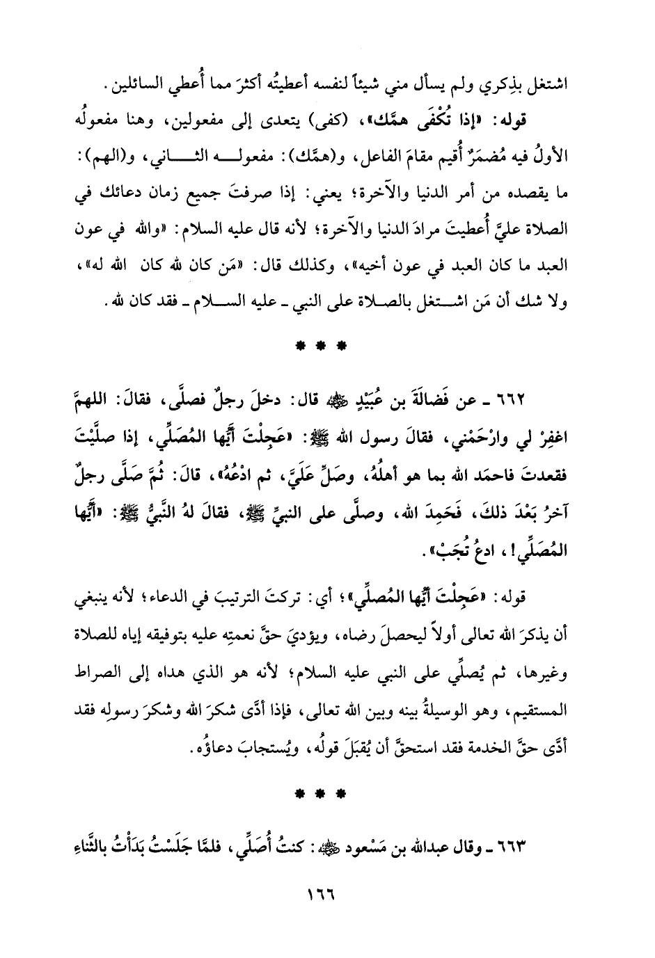 662 - عن فَضالَةَ بن عُبَيْدٍ - رضي الله عنه - قال: دخلَ رجلٌ فصلَّى، فقالَ: اللهمَّ اغفِرْ لي وارْحمْني، فقالَ رسول الله - صلى الله عليه وسلم -: "عَجِلْتَ أَيُّها المُصَلِّي، إذا صلَّيْتَ فقعدتَ فاحمَد الله بما هو أهلُهُ، وصَلِّ عَلَيَّ، ثم ادْعُهُ"، قالَ: ثُمَّ صَلَّى رجلٌ آخرُ بَعْدَ ذلكَ، فَحَمِدَ الله، وصلَّى على النبيِّ - صلى الله عليه وسلم -، فقالَ لهُ النَّبيُّ - صلى الله عليه وسلم -: "أَيُّها المُصَلِّي!، ادعُ تُجَبْ".
