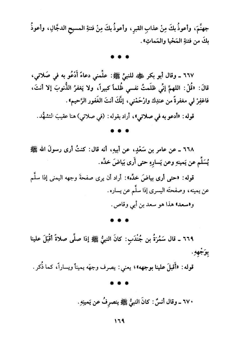 668 - عن عامر بن سَعْدٍ، عن أبيهِ، أنه قال: كنتُ أرى رسولَ الله - صلى الله عليه وسلم - يُسَلِّم عن يَمينهِ وعن يَسارِهِ حتى أَرى بَياضَ خدِّه.